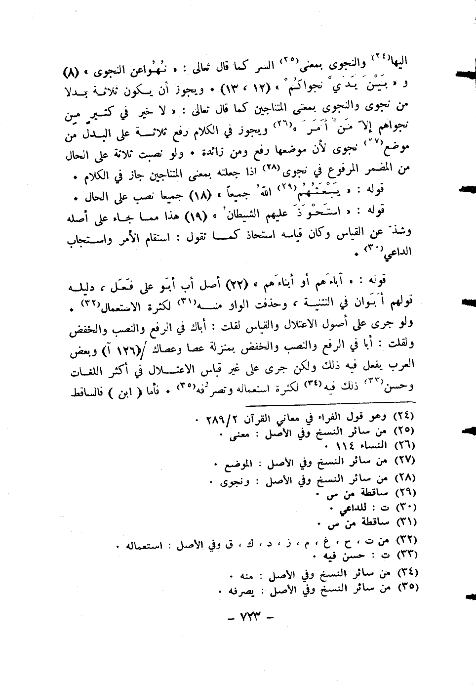 اليها والنجوى بِمَعْنى السركما قَالَ تَعَالَى نهوا عَن النَّجْوَى وَبَين يَدي نَجوَاكُمْ وَيجوز أَن يكون ثَلَاثَة بَدَلا من نجوى والنجوى بِمَعْنى المتناجين كَمَا قَالَ تَعَالَى لَا خير فِي كثير من نَجوَاهُمْ إِلَّا من أَمر وَيجوز فِي الْكَلَام رفع ثَلَاثَة على الْبَدَل من مَوضِع نجوى لِأَن موضعهَا رفع وَمن زَائِدَة وَلَو نصبت ثَلَاثَة على الْحَال من الْمُضمر الْمَرْفُوع فِي نجوى اذا جعلته بِمَعْنى المتناجين جَازَ فِي الْكَلَام
