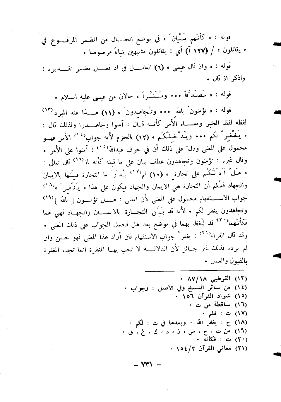 قَوْله تؤمنون بِاللَّه وتجاهدون هَذَا عِنْد الْمبرد لَفظه لفظ الْخَبَر وَمَعْنَاهُ الْأَمر كَأَنَّهُ قَالَ آمنُوا وَجَاهدُوا وَلذَلِك قَالَ يغْفر لكم ويدخلكم بِالْجَزْمِ لِأَنَّهُ جَوَاب الْأَمر فَهُوَ مَحْمُول على الْمَعْنى وَدلّ على ذَلِك أَن فِي حرف عبد الله آمنُوا على الْأَمر وَقَالَ غَيره تؤمنون وتجاهدون عطف بَيَان على مَا قبله كَأَنَّهُ لما قَالَ تَعَالَى هَل أدلكم على تِجَارَة لم يدر مَا التِّجَارَة فبينها بالايمان وَالْجهَاد فَعلم أَن التِّجَارَة هِيَ الايمان وَالْجهَاد فَيكون على هَذَا يغْفر جَوَاب الِاسْتِفْهَام مَحْمُول على الْمَعْنى لِأَن الْمَعْنى هَل تؤمنون بِاللَّه وتجاهدون يغْفر لكم لِأَنَّهُ قد بَين التِّجَارَة بالايمان وَالْجهَاد فَهِيَ هما فكأنهما قد لفظ بهما فِي مَوضِع بعد هَل فَحمل الْجَواب على ذَلِك الْمَعْنى وَقد قَالَ الْفراء يغْفر جَوَاب الِاسْتِفْهَام فان اراد هَذَا الْمَعْنى فَهُوَ حسن وان لم يردهُ فَذَلِك غير جَائِز لِأَن الدّلَالَة لَا تجب بهَا الْمَغْفِرَة انما تجب الْمَغْفِرَة بِالْقبُولِ وَالْعَمَل