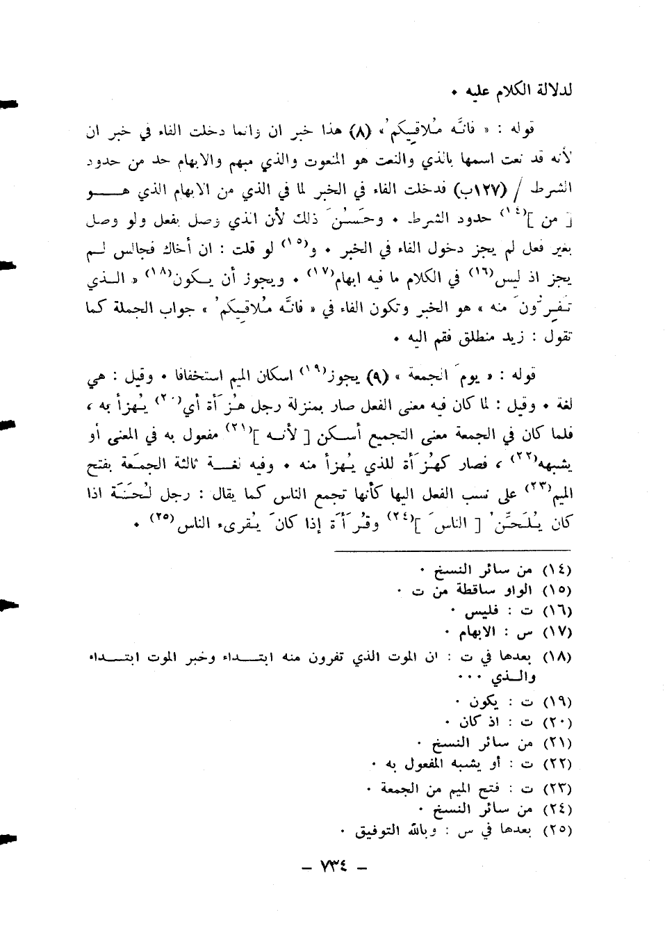 قَوْله فانه ملاقيكم هَذَا خبر ان وانما دخلت الْفَاء فِي خبر ان لِأَنَّهُ قد نعت اسْمهَا بِالَّذِي والنعت هُوَ المنعوت وَالَّذِي مُبْهَم والابهام حد من حُدُود الشَّرْط فَدخلت الْفَاء فِي الْخَبَر لما فِي الَّذِي من الابهام الَّذِي هُوَ من حُدُود الشَّرْط وَحسن ذَلِك لِأَن الَّذِي وصل بِفعل وَلَو وصل بِغَيْر فعل لم يجز دُخُول الْفَاء فِي الْخَبَر وَلَو قلت ان أَخَاك فجالس لم يجز اذ لَيْسَ فِي الْكَلَام مَا فِيهِ ابهام وَيجوز أَن يكون الَّذِي تفرون مِنْهُ هُوَ الْخَبَر وَتَكون الْفَاء فِي فانه ملاقيكم جَوَاب الْجُمْلَة كَمَا تَقول زيد منطلق فَقُمْ اليه