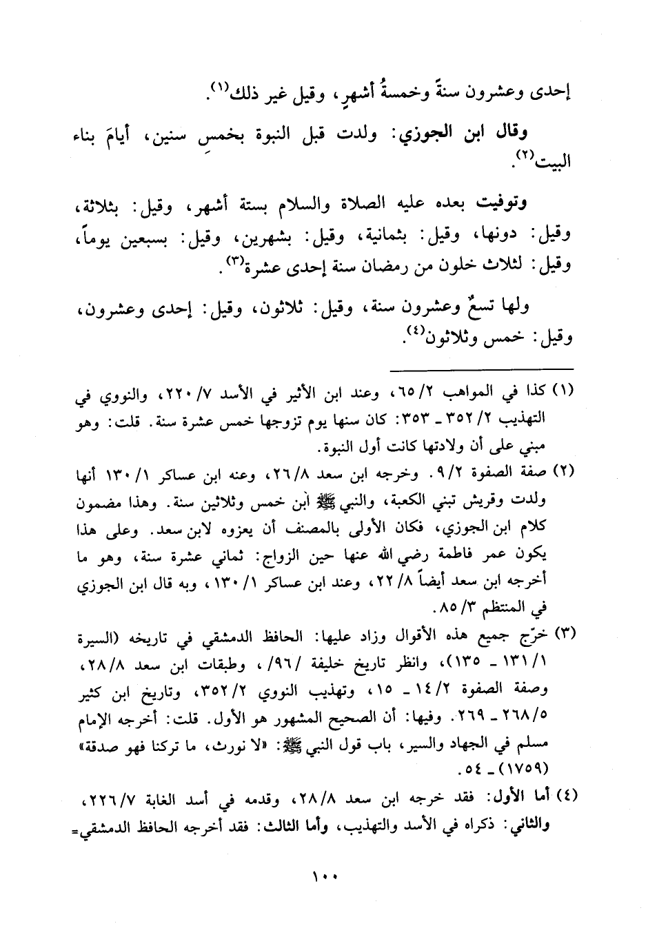 (¬2) صفة الصفوة 2/ 9. وخرجه ابن سعد 8/ 26، وعنه ابن عساكر 1/ 130 أنها ولدت وقريش تبني الكعبة، والنبي صلى الله عليه وسلم ابن خمس وثلاثين سنة. وهذا مضمون كلام ابن الجوزي، فكان الأولى بالمصنف أن يعزوه لابن سعد. وعلى هذا يكون عمر فاطمة رضي الله عنها حين الزواج: ثماني عشرة سنة، وهو ما أخرجه ابن سعد أيضا 8/ 22، وعند ابن عساكر 1/ 130، وبه قال ابن الجوزي في المنتظم 3/ 85.