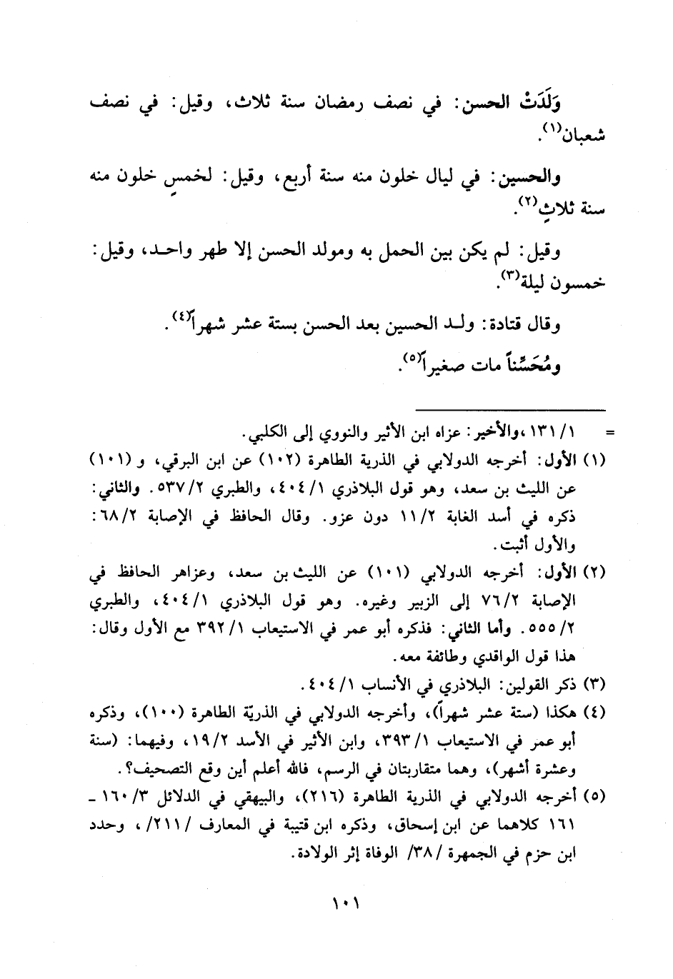 (¬5) أخرجه الدولابي في الذرية الطاهرة (216)، والبيهقي في الدلائل 3/ 160 - 161 كلاهما عن ابن إسحاق، وذكره ابن قتيبة في المعارف/211/، وحدد ابن حزم في الجمهرة/38/الوفاة إثر الولادة.