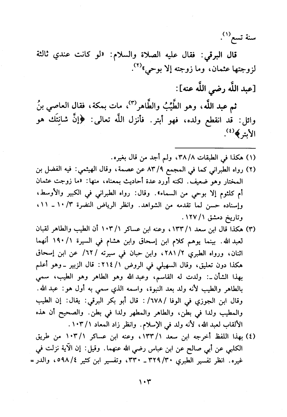 (¬3) هكذا قال ابن سعد 1/ 133، وعنه ابن عساكر 1/ 103 أن الطيب والطاهر لقبان لعبد الله. بينما يوهم كلام ابن إسحاق وابن هشام في السيرة 1/ 190 أنهما اثنان، ورواه الطبري 2/ 281، وابن حبان في سيرته/62/عن ابن إسحاق هكذا دون تعليق، وقال السهيلي في الروض 1/ 214: قال الزبير-وهو أعلم بهذا الشأن-: ولدت له القاسم، وعبد الله وهو الطاهر وهو الطيب، سمي بالطاهر والطيب لأنه ولد بعد النبوة، واسمه الذي سمي به أول هو: عبد الله. وقال ابن الجوزي في الوفا/678/: قال أبو بكر البرقي: يقال: إن الطيب والمطيب ولدا في بطن، والطاهر والمطهر ولدا في بطن. والصحيح أن هذه الألقاب لعبد الله، لأنه ولد في الإسلام. وانظر زاد المعاد 1/ 103.
