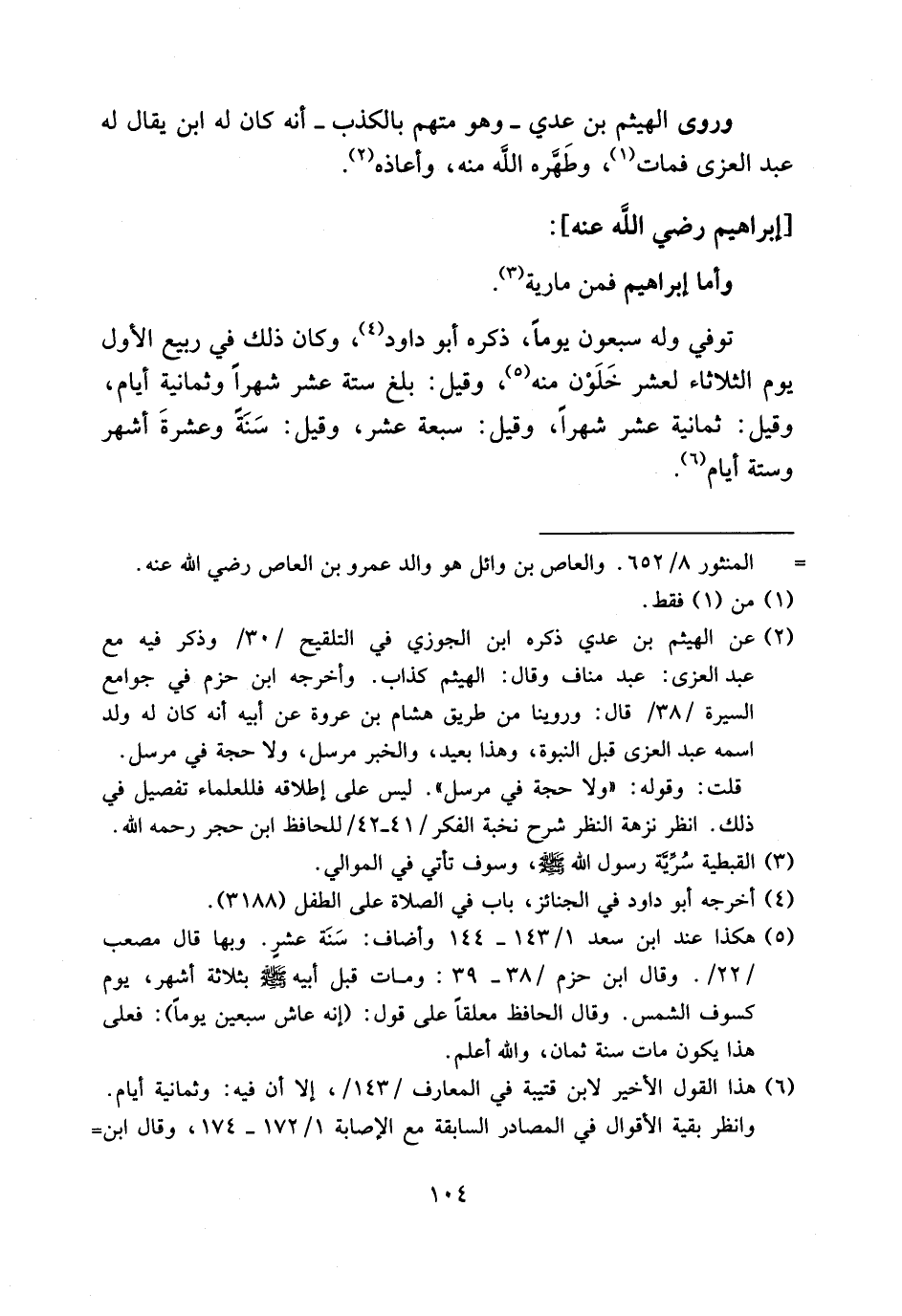 (¬5) هكذا عند ابن سعد 1/ 143 - 144 وأضاف: سنة عشر. وبها قال مصعب /22/. وقال ابن حزم/38 - 39: ومات قبل أبيه صلى الله عليه وسلم بثلاثة أشهر، يوم كسوف الشمس. وقال الحافظ معلقا على قول: (إنه عاش سبعين يوما): فعلى هذا يكون مات سنة ثمان، والله أعلم.