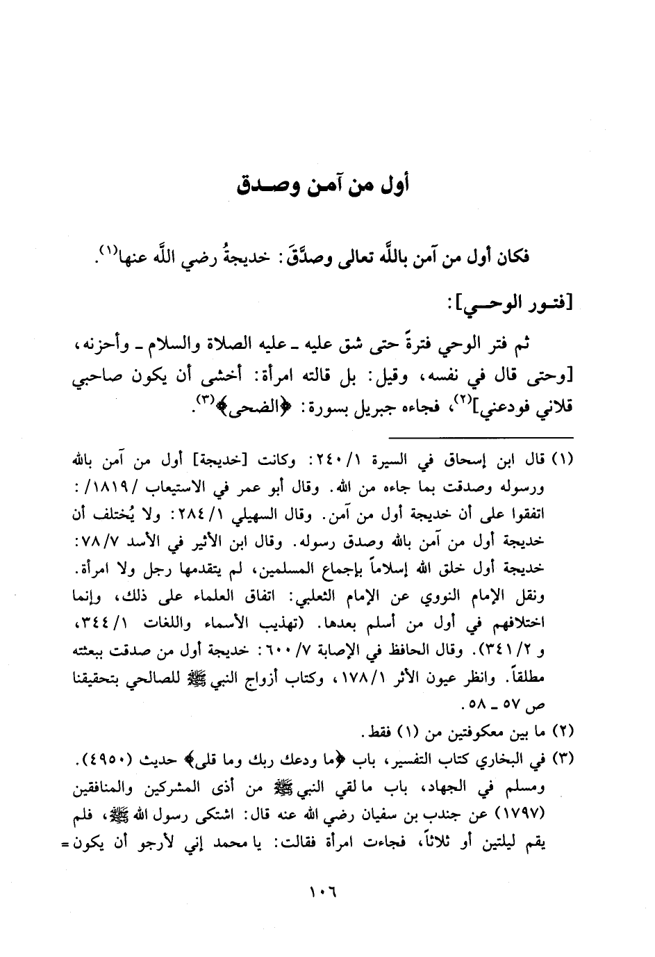 (¬1) قال ابن إسحاق في السيرة 1/ 240: وكانت [خديجة] أول من آمن بالله ورسوله وصدقت بما جاءه من الله. وقال أبو عمر في الاستيعاب/1819/: اتفقوا على أن خديجة أول من آمن. وقال السهيلي 1/ 284: ولا يختلف أن خديجة أول من آمن بالله وصدق رسوله. وقال ابن الأثير في الأسد 7/ 78: خديجة أول خلق الله إسلاما بإجماع المسلمين، لم يتقدمها رجل ولا امرأة. ونقل الإمام النووي عن الإمام الثعلبي: اتفاق العلماء على ذلك، وإنما اختلافهم في أول من أسلم بعدها. (تهذيب الأسماء واللغات 1/ 344، و 2/ 341). وقال الحافظ في الإصابة 7/ 600: خديجة أول من صدقت ببعثته مطلقا. وانظر عيون الأثر 1/ 178، وكتاب أزواج النبي صلى الله عليه وسلم للصالحي بتحقيقنا ص 57 - 58.