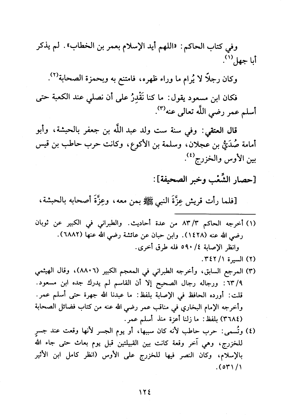 (¬3) المرجع السابق، وأخرجه الطبراني في المعجم الكبير (8806)، وقال الهيثمي 9/ 63: ورجاله رجال الصحيح إلا أن القاسم لم يدرك جده ابن مسعود. قلت: أورده الحافظ في الإصابة بلفظ: ما عبدنا الله جهرة حتى أسلم عمر. وأخرجه الإمام البخاري في مناقب عمر رضي الله عنه من كتاب فضائل الصحابة (3684) بلفظ: ما زلنا أعزة منذ أسلم عمر.