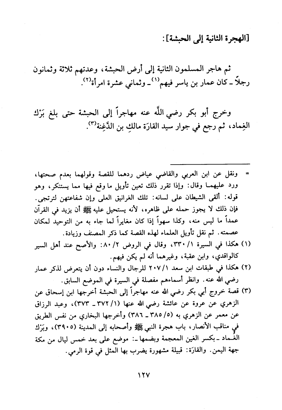 (¬3) قصة خروج أبي بكر رضي الله عنه مهاجرا إلى الحبشة أخرجها ابن إسحاق عن الزهري عن عروة عن عائشة رضي الله عنها (1/ 372 - 373)، وعبد الرزاق عن معمر عن الزهري به (5/ 385 - 386) وأخرجها البخاري من نفس الطريق في مناقب الأنصار، باب هجرة النبي صلى الله عليه وسلم وأصحابه إلى المدينة (3905)، وبرك الغماد-بكسر الغين المعجمة وبضمها-: موضع على بعد خمس ليال من مكة جهة اليمن. والقارة: قبيلة مشهورة يضرب بها المثل في قوة الرمي.