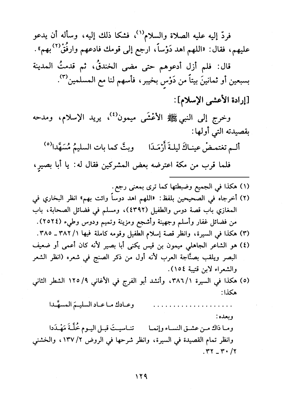 (¬5) هكذا في السيرة 1/ 386، وأنشد أبو الفرج في الأغاني 9/ 125 الشطر الثاني هكذا:. . . . . . . . . . . وعادك ما عاد السليم المسهّدا وبعده: وما ذاك من عشق النساء وإنما تناسيت قبل اليوم خلّة مهددا وانظر تمام القصيدة في السيرة، وانظر شرحها في الروض 2/ 137، والخشني 2/ 30 - 32.