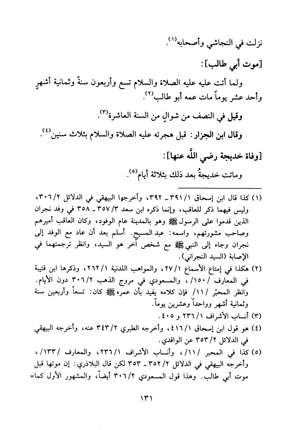 (¬5) كذا في المحبر/11/، وأنساب الأشراف 1/ 236، والمعارف/133/، وأخرجه البيهقي في الدلائل 2/ 352 - 353 لكن قال البلاذري: إن موتها قبل موت أبي طالب. وهذا قول المسعودي 2/ 306 أيضا، والمشهور الأول كما-