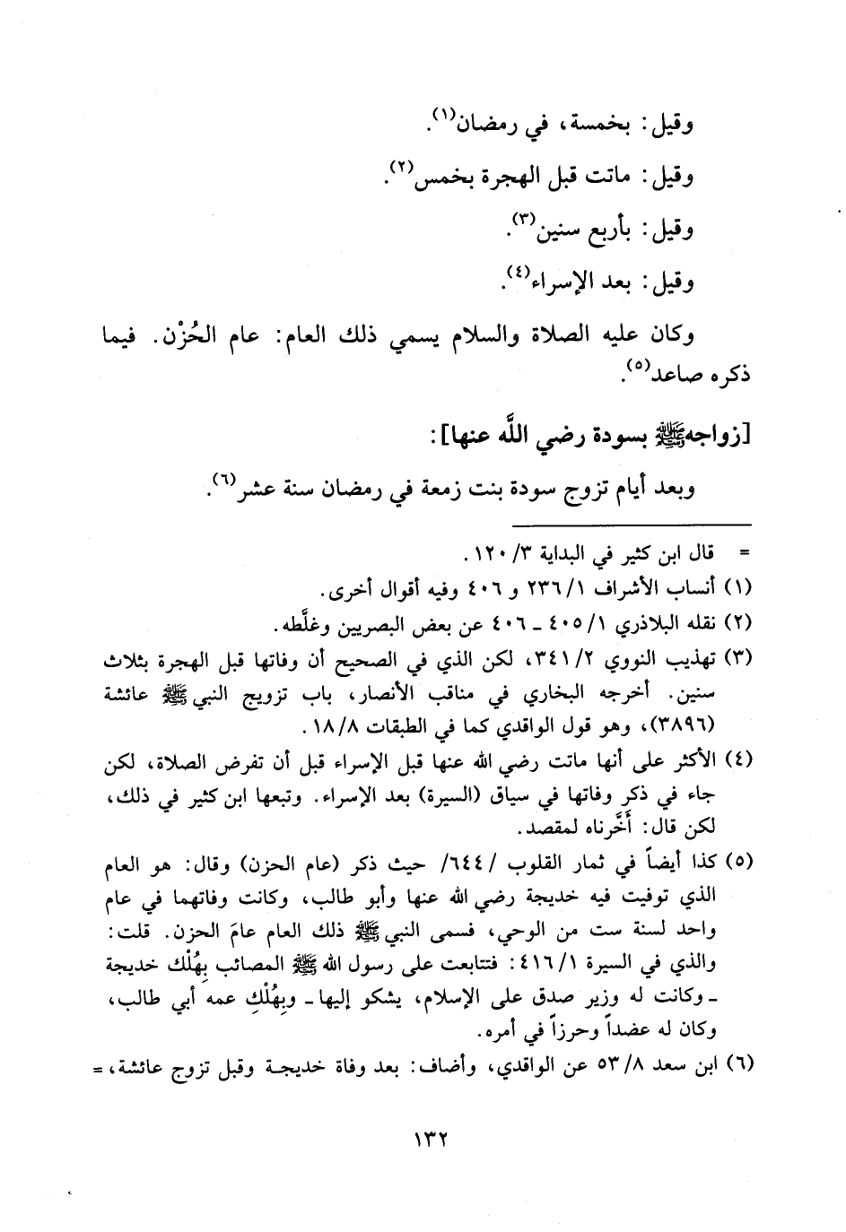 (¬4) الأكثر على أنها ماتت رضي الله عنها قبل الإسراء قبل أن تفرض الصلاة، لكن جاء في ذكر وفاتها في سياق (السيرة) بعد الإسراء. وتبعها ابن كثير في ذلك، لكن قال: أخّرناه لمقصد.