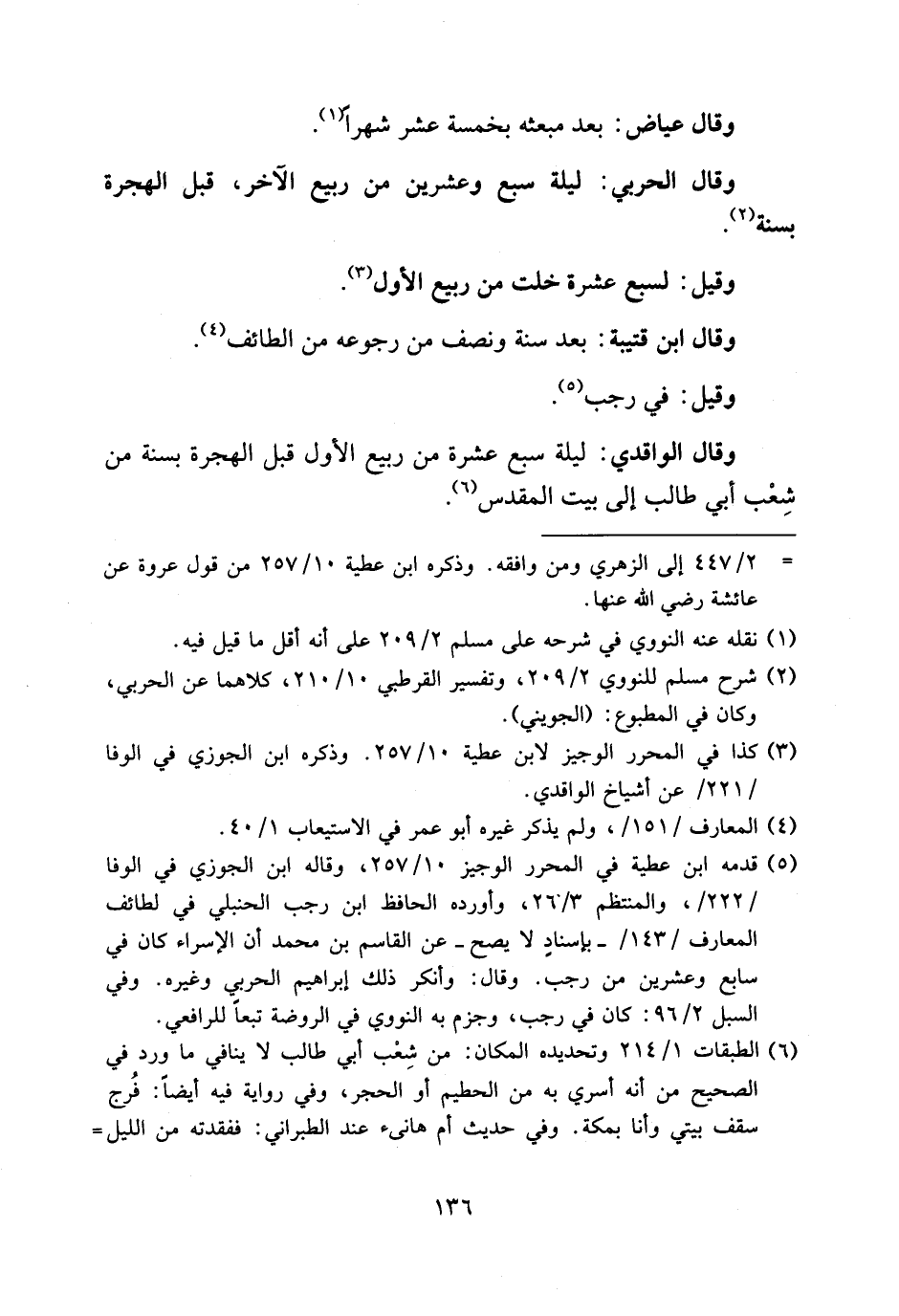 (¬5) قدمه ابن عطية في المحرر الوجيز 10/ 257، وقاله ابن الجوزي في الوفا /222/، والمنتظم 3/ 26، وأورده الحافظ ابن رجب الحنبلي في لطائف المعارف/143/-بإسناد لا يصح-عن القاسم بن محمد أن الإسراء كان في سابع وعشرين من رجب. وقال: وأنكر ذلك إبراهيم الحربي وغيره. وفي السبل 2/ 96: كان في رجب، وجزم به النووي في الروضة تبعا للرافعي.