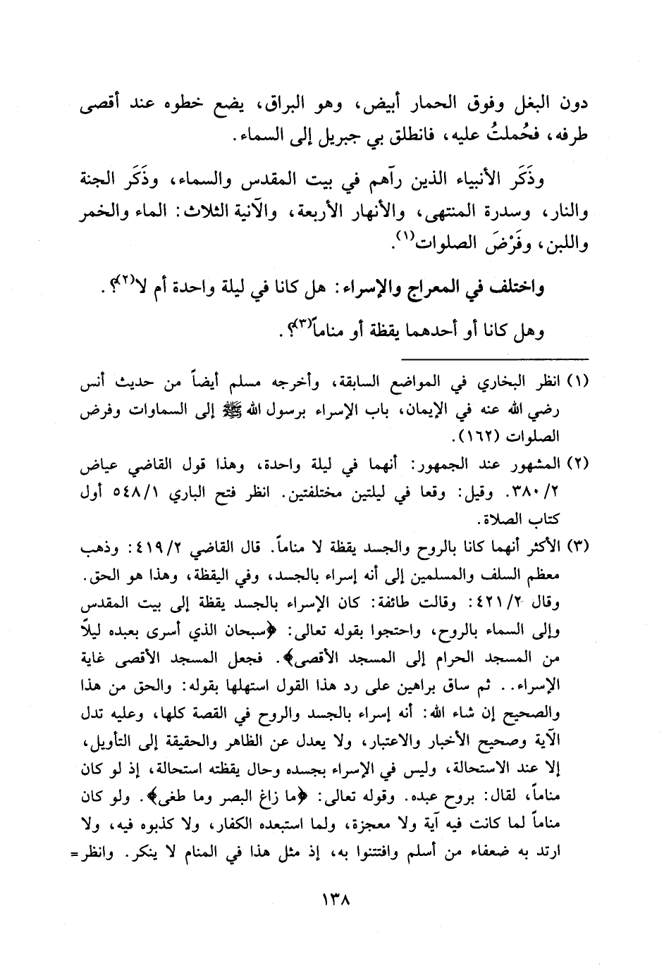(¬3) الأكثر أنهما كانا بالروح والجسد يقظة لا مناما. قال القاضي 2/ 419: وذهب معظم السلف والمسلمين إلى أنه إسراء بالجسد، وفي اليقظة، وهذا هو الحق. وقال 2/ 421: وقالت طائفة: كان الإسراء بالجسد يقظة إلى بيت المقدس وإلى السماء بالروح، واحتجوا بقوله تعالى: سُبْحانَ الَّذِي أَسْرى بِعَبْدِهِ لَيْلاً مِنَ الْمَسْجِدِ الْحَرامِ إِلَى الْمَسْجِدِ الْأَقْصَى. فجعل المسجد الأقصى غاية الإسراء. . ثم ساق براهين على رد هذا القول استهلها بقوله: والحق من هذا والصحيح إن شاء الله: أنه إسراء بالجسد والروح في القصة كلها، وعليه تدل الآية وصحيح الأخبار والاعتبار، ولا يعدل عن الظاهر والحقيقة إلى التأويل، إلا عند الاستحالة، وليس في الإسراء بجسده وحال يقظته استحالة، إذ لو كان مناما، لقال: بروح عبده. وقوله تعالى: ما زاغَ الْبَصَرُ وَما طَغى. ولو كان مناما لما كانت فيه آية ولا معجزة، ولما استبعده الكفار، ولا كذبوه فيه، ولا ارتد به ضعفاء من أسلم وافتتنوا به، إذ مثل هذا في المنام لا ينكر. وانظر-