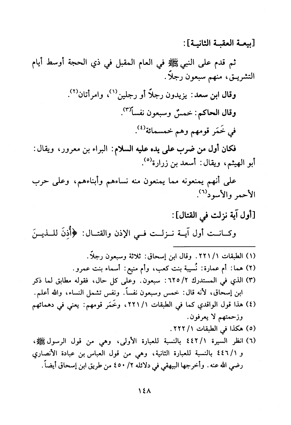 (¬6) انظر السيرة 1/ 442 بالنسبة للعبارة الأولى، وهي من قول الرسول صلى الله عليه وسلم، و 1/ 446 بالنسبة للعبارة الثانية، وهي من قول العباس بن عبادة الأنصاري رضي الله عنه. وأخرجها البيهقي في دلائله 2/ 450 من طريق ابن إسحاق أيضا.
