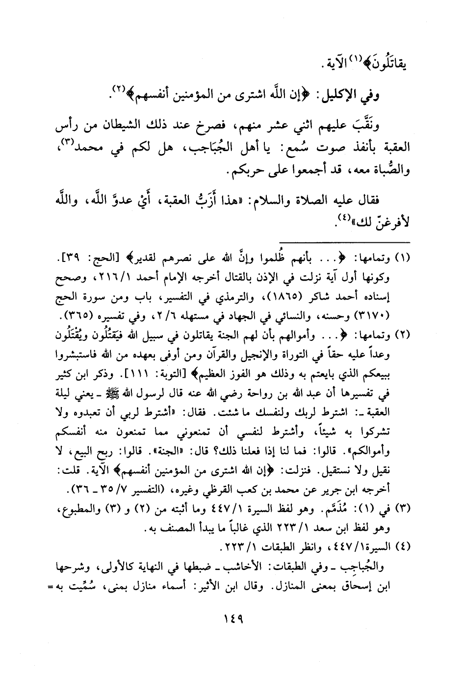 (¬2) وتمامها:. . . وَأَمْوالَهُمْ بِأَنَّ لَهُمُ الْجَنَّةَ يُقاتِلُونَ فِي سَبِيلِ اللهِ فَيَقْتُلُونَ وَيُقْتَلُونَ وَعْداً عَلَيْهِ حَقًّا فِي التَّوْراةِ وَالْإِنْجِيلِ وَالْقُرْآنِ وَمَنْ أَوْفى بِعَهْدِهِ مِنَ اللهِ فَاسْتَبْشِرُوا بِبَيْعِكُمُ الَّذِي بايَعْتُمْ بِهِ وَذلِكَ هُوَ الْفَوْزُ الْعَظِيمُ [التوبة:111]. وذكر ابن كثير في تفسيرها أن عبد الله بن رواحة رضي الله عنه قال لرسول الله صلى الله عليه وسلم-يعني ليلة العقبة-: اشترط لربك ولنفسك ما شئت. فقال: «أشترط لربي أن تعبدوه ولا تشركوا به شيئا، وأشترط لنفسي أن تمنعوني مما تمنعون منه أنفسكم وأموالكم». قالوا: فما لنا إذا فعلنا ذلك؟ قال: «الجنة». قالوا: ربح البيع، لا نقيل ولا نستقيل. فنزلت: إِنَّ اللهَ اِشْتَرى مِنَ الْمُؤْمِنِينَ أَنْفُسَهُمْ الآية. قلت: أخرجه ابن جرير عن محمد بن كعب القرظي وغيره، (التفسير 7/ 35 - 36).