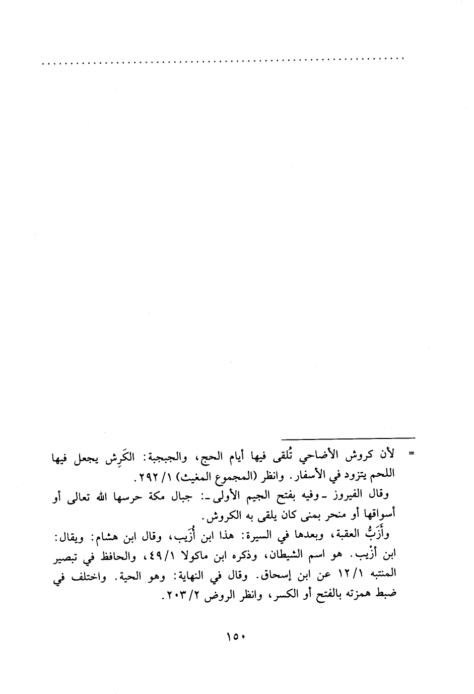= لأن كروش الأضاحي تلقى فيها أيام الحج، والجبجبة: الكرش يجعل فيها اللحم يتزود في الأسفار. وانظر (المجموع المغيث) 1/ 292. وقال الفيروز-وفيه بفتح الجيم الأولى-: جبال مكة حرسها الله تعالى أو أسواقها أو منحر بمنى كان يلقى به الكروش. وأزبّ العقبة، وبعدها في السيرة: هذا ابن أزيب، وقال ابن هشام: ويقال: ابن أزيب. هو اسم الشيطان، وذكره ابن ماكولا 1/ 49، والحافظ في تبصير المنتبه 1/ 12 عن ابن إسحاق. وقال في النهاية: وهو الحية. واختلف في ضبط همزته بالفتح أو الكسر، وانظر الروض 2/ 203.
