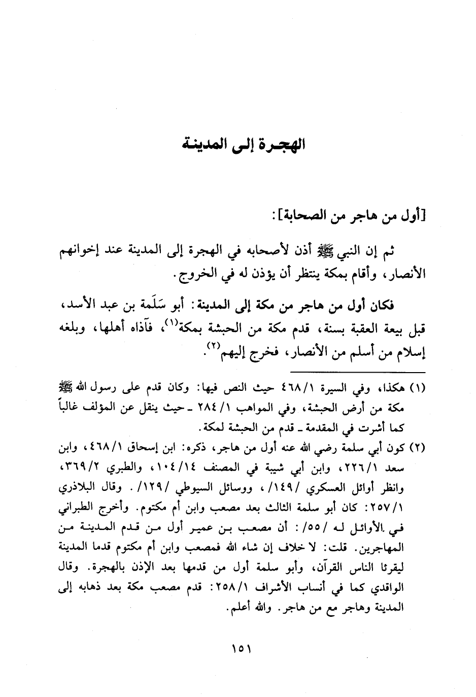 (¬2) كون أبي سلمة رضي الله عنه أول من هاجر، ذكره: ابن إسحاق 1/ 468، وابن سعد 1/ 226، وابن أبي شيبة في المصنف 14/ 104، والطبري 2/ 369، وانظر أوائل العسكري/149/، ووسائل السيوطي/129/. وقال البلاذري 1/ 257: كان أبو سلمة الثالث بعد مصعب وابن أم مكتوم. وأخرج الطبراني في الأوائل له/55/: أن مصعب بن عمير أول من قدم المدينة من المهاجرين. قلت: لا خلاف إن شاء الله فمصعب وابن أم مكتوم قدما المدينة ليقرئا الناس القرآن، وأبو سلمة أول من قدمها بعد الإذن بالهجرة. وقال الواقدي كما في أنساب الأشراف 1/ 258: قدم مصعب مكة بعد ذهابه إلى المدينة وهاجر مع من هاجر. والله أعلم.