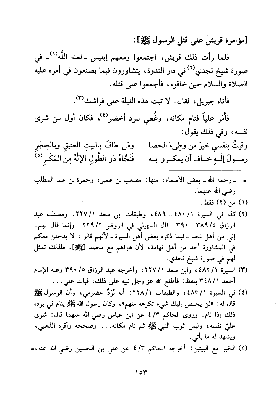 (¬2) كذا في السيرة 1/ 480 - 489، وطبقات ابن سعد 1/ 227، ومصنف عبد الرزاق 5/ 389 - 390. قال السهيلي في الروض 2/ 229: وإنما قال لهم: إني من أهل نجد-فيما ذكره بعض أهل السيرة-لأنهم قالوا: لا يدخلن معكم في المشاورة أحد من أهل تهامة، لأن هواهم مع محمد [صلى الله عليه وسلم]، فلذلك تمثل لهم في صورة شيخ نجدي.