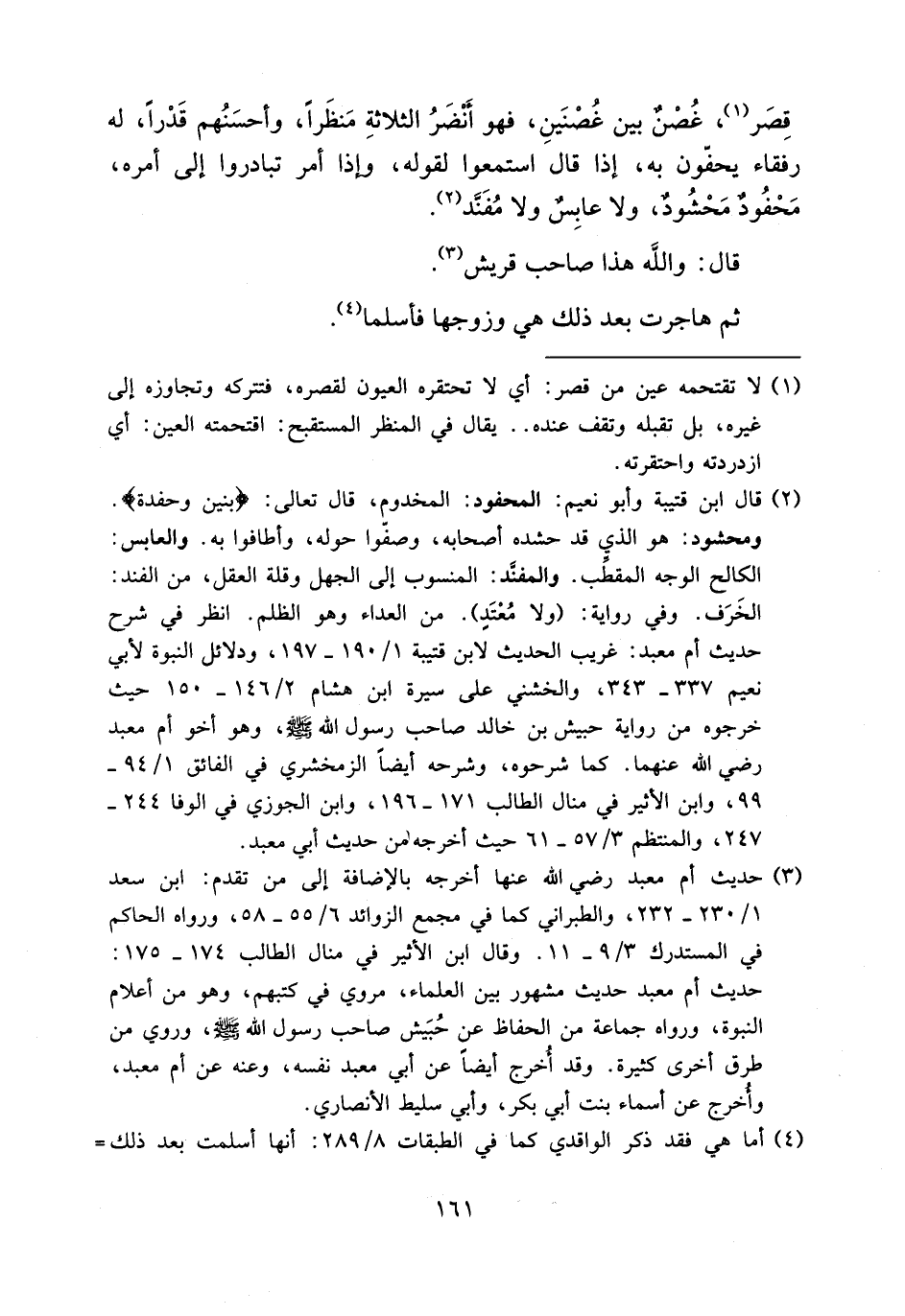 (¬2) قال ابن قتيبة وأبو نعيم: المحفود: المخدوم، قال تعالى: بَنِينَ وَحَفَدَةً. ومحشود: هو الذي قد حشده أصحابه، وصفّوا حوله، وأطافوا به. والعابس: الكالح الوجه المقطّب. والمفنّد: المنسوب إلى الجهل وقلة العقل، من الفند: الخرف. وفي رواية: (ولا معتد). من العداء وهو الظلم. انظر في شرح حديث أم معبد: غريب الحديث لابن قتيبة 1/ 190 - 197، ودلائل النبوة لأبي نعيم 337 - 343، والخشني على سيرة ابن هشام 2/ 146 - 150 حيث خرجوه من رواية حبيش بن خالد صاحب رسول الله صلى الله عليه وسلم، وهو أخو أم معبد رضي الله عنهما. كما شرحوه، وشرحه أيضا الزمخشري في الفائق 1/ 94 - 99، وابن الأثير في منال الطالب 171 - 196، وابن الجوزي في الوفا 244 - 247، والمنتظم 3/ 57 - 61 حيث أخرجه من حديث أبي معبد.
