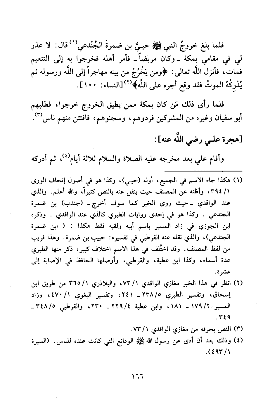 (¬1) هكذا جاء الاسم في الجميع، أوله (حيي)، وكذا هو في أصول إتحاف الورى 1/ 394، وأظنه عن المصنف حيث ينقل عنه بالنص كثيرا، والله أعلم. والذي عند الواقدي-حيث روى الخبر كما سوف أخرج- (جندب) بن ضمرة الجندعي. وكذا هو في إحدى روايات الطبري كالذي عند الواقدي. وذكره ابن الجوزي في زاد المسير باسم أبيه ولقبه فقط هكذا: (ابن ضمرة الجندعي)، والذي نقله عنه القرطبي في تفسيره: حبيب بن ضمرة. وهذا قريب من لفظ المصنف. وقد اختلف في هذا الاسم اختلاف كبير، ذكر منها الطبري عدة أسماء، وكذا ابن عطية، والقرطبي، وأوصلها الحافظ في الإصابة إلى عشرة.