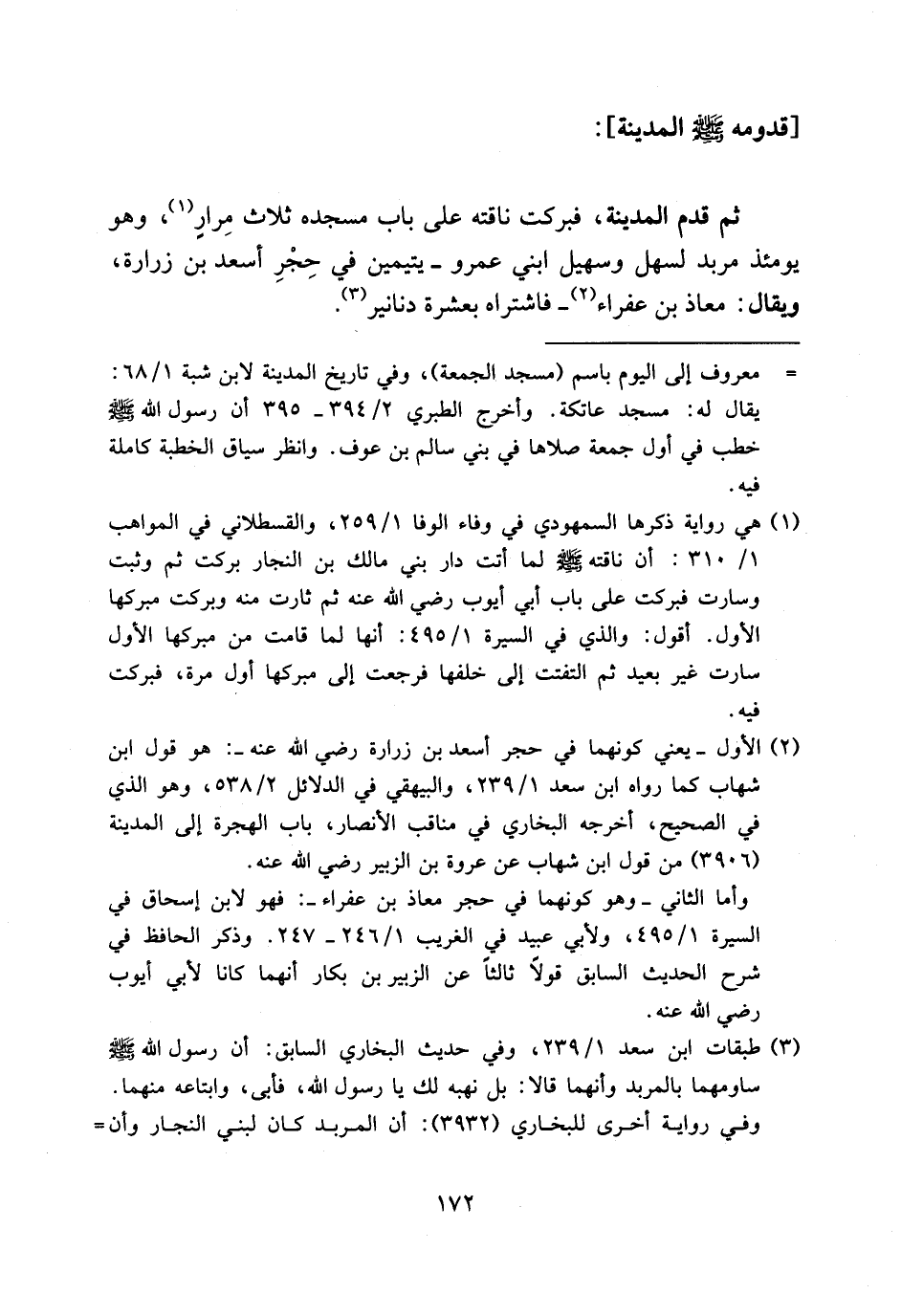 (¬1) هي رواية ذكرها السمهودي في وفاء الوفا 1/ 259، والقسطلاني في المواهب 1/ 310: أن ناقته صلى الله عليه وسلم لما أتت دار بني مالك بن النجار بركت ثم وثبت وسارت فبركت على باب أبي أيوب رضي الله عنه ثم ثارت منه وبركت مبركها الأول. أقول: والذي في السيرة 1/ 495: أنها لما قامت من مبركها الأول سارت غير بعيد ثم التفتت إلى خلفها فرجعت إلى مبركها أول مرة، فبركت فيه.
