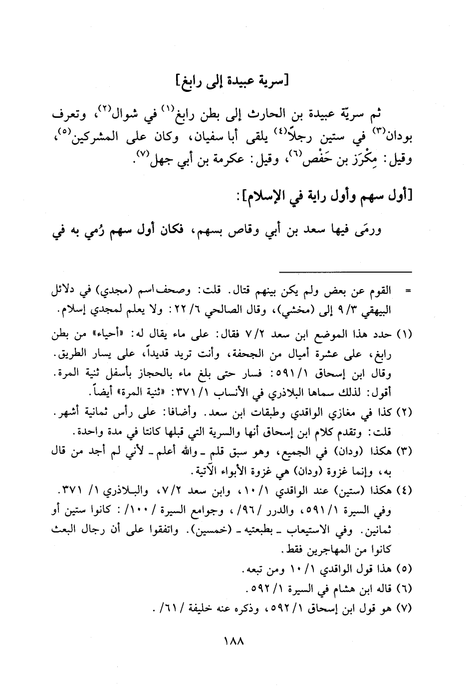 (¬4) هكذا (ستين) عند الواقدي 1/ 10، وابن سعد 2/ 7، والبلاذري 1/ 371. وفي السيرة 1/ 591، والدرر/96/، وجوامع السيرة/100/: كانوا ستين أو ثمانين. وفي الاستيعاب-بطبعتيه- (خمسين). واتفقوا على أن رجال البعث كانوا من المهاجرين فقط.