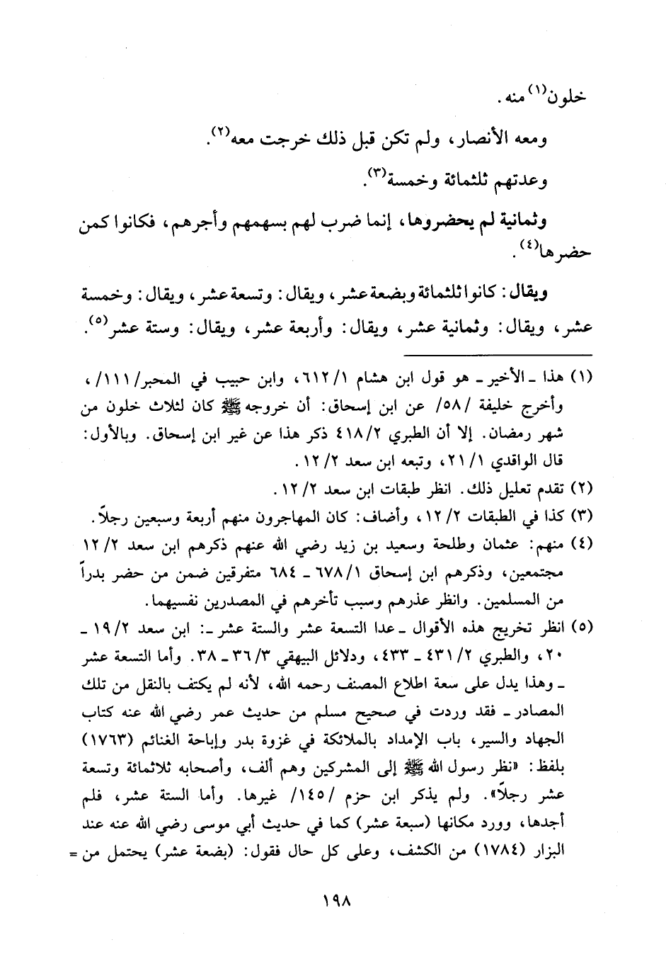 (¬4) منهم: عثمان وطلحة وسعيد بن زيد رضي الله عنهم ذكرهم ابن سعد 2/ 12 مجتمعين، وذكرهم ابن إسحاق 1/ 678 - 684 متفرقين ضمن من حضر بدرا من المسلمين. وانظر عذرهم وسبب تأخرهم في المصدرين نفسيهما.