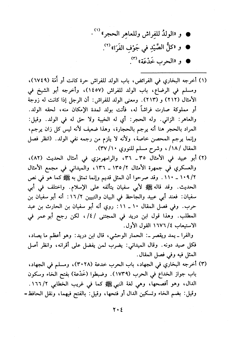 (¬2) أبو عبيد في الأمثال 35 - 36، والرامهرمزي في أمثال الحديث (82)، والعسكري في جمهرة الأمثال 2/ 135 - 136، والميداني في مجمع الأمثال 2/ 109 - 110. وقد صرحوا أن المثل قديم وإنما تمثل به صلى الله عليه وسلم كما هو في نص الحديث. وقد قاله صلى الله عليه وسلم لأبي سفيان يتألفه على الإسلام. واختلف في أبي سفيان: فعند أبي عبيد والجاحظ في البيان والتبيين 2/ 16: أنه أبو سفيان بن حرب. وفي فصل المقال 10 - 11: روي أنه أبو سفيان بن الحارث بن عبد المطلب. وهذا قول ابن دريد في المجتنى/4/، لكن رجح أبو عمر في الاستيعاب 4/ 1676 القول الأول. والفرا-يمد ويقصر-: الحمار الوحشي، قال ابن دريد: وهو أعظم ما يصاد، فكل صيد دونه. وقال الميداني: يضرب لمن يفضل على أقرانه، وانظر أصل المثل فيه وفي فصل المقال.