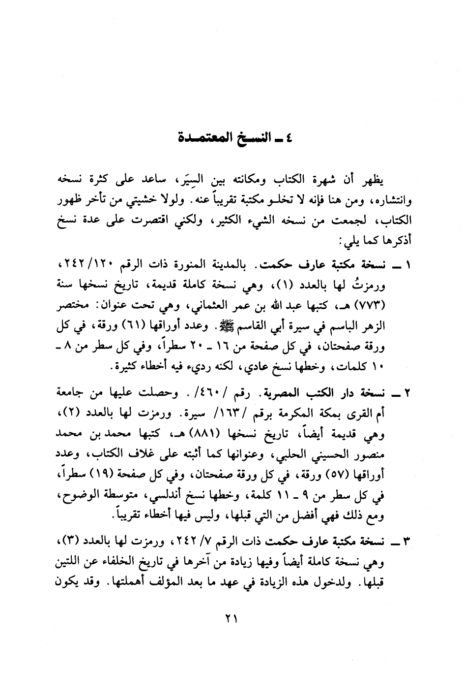 3 - نسخة مكتبة عارف حكمت ذات الرقم 7/ 242، ورمزت لها بالعدد (3)، وهي نسخة كاملة أيضا وفيها زيادة من آخرها في تاريخ الخلفاء عن اللتين قبلها. ولدخول هذه الزيادة في عهد ما بعد المؤلف أهملتها. وقد يكون