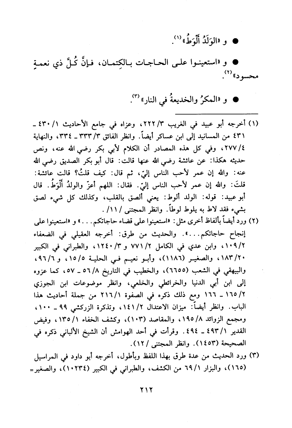 (¬2) ورد أيضا بألفاظ أخرى مثل: «استعينوا على قضاء حاجاتكم. . .» و «استعينوا على إنجاح حاجاتكم. . .». والحديث من طرق: أخرجه العقيلي في الضعفاء 2/ 109، وابن عدي في الكامل 2/ 771 و 3/ 1240، والطبراني في الكبير 20/ 183، والصغير (1186)، وأبو نعيم في الحلية 5/ 15، و 6/ 96، والبيهقي في الشعب (6655)، والخطيب في التاريخ 8/ 56 - 57، كما عزوه إلى ابن أبي الدنيا والخرائطي والخلعي، وانظر موضوعات ابن الجوزي 2/ 165 - 166 ومع ذلك ذكره في الصفوة 1/ 216 من جملة أحاديث هذا الباب. وانظر أيضا: ميزان الاعتدال 2/ 141، وتذكرة الزركشي 99 - 100، ومجمع الزوائد 8/ 195، والمقاصد (103)، وكشف الخفاء 1/ 135، وفيض القدير 1/ 493 - 494. وقرأت في أحد الهوامش أن الشيخ الألباني ذكره في الصحيحة (1453). وانظر المجتنى/12).