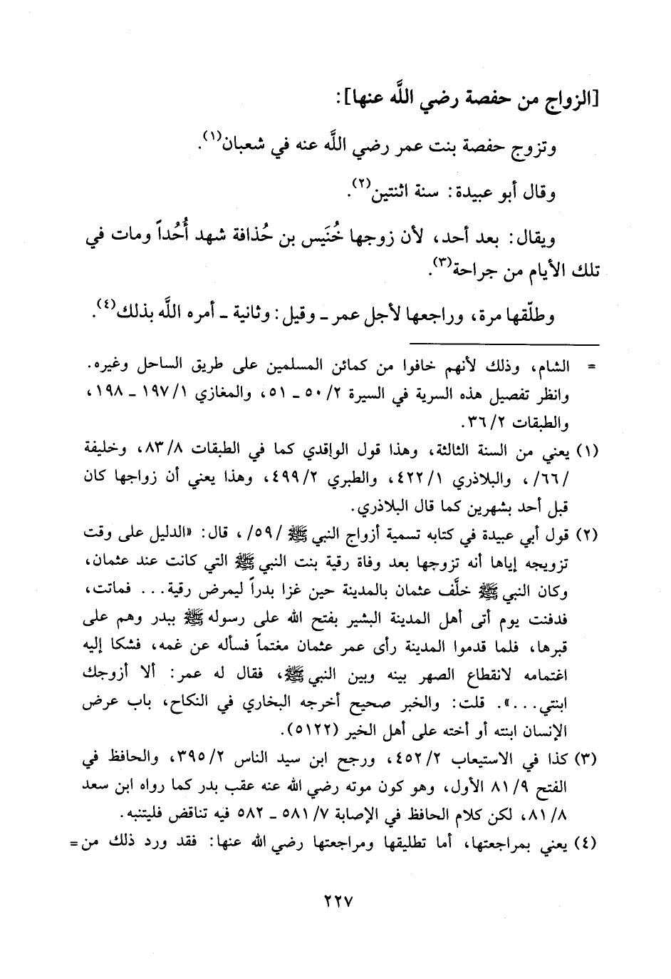 (¬2) قول أبي عبيدة في كتابه تسمية أزواج النبي صلى الله عليه وسلم/59/، قال: «الدليل على وقت تزويجه إياها أنه تزوجها بعد وفاة رقية بنت النبي صلى الله عليه وسلم التي كانت عند عثمان، وكان النبي صلى الله عليه وسلم خلّف عثمان بالمدينة حين غزا بدرا ليمرض رقية. . . فماتت، فدفنت يوم أتى أهل المدينة البشير بفتح الله على رسوله صلى الله عليه وسلم ببدر وهم على قبرها، فلما قدموا المدينة رأى عمر عثمان مغتما فسأله عن غمه، فشكا إليه اغتمامه لانقطاع الصهر بينه وبين النبي صلى الله عليه وسلم، فقال له عمر: ألا أزوجك ابنتي. . .». قلت: والخبر صحيح أخرجه البخاري في النكاح، باب عرض الإنسان ابنته أو أخته على أهل الخير (5122).