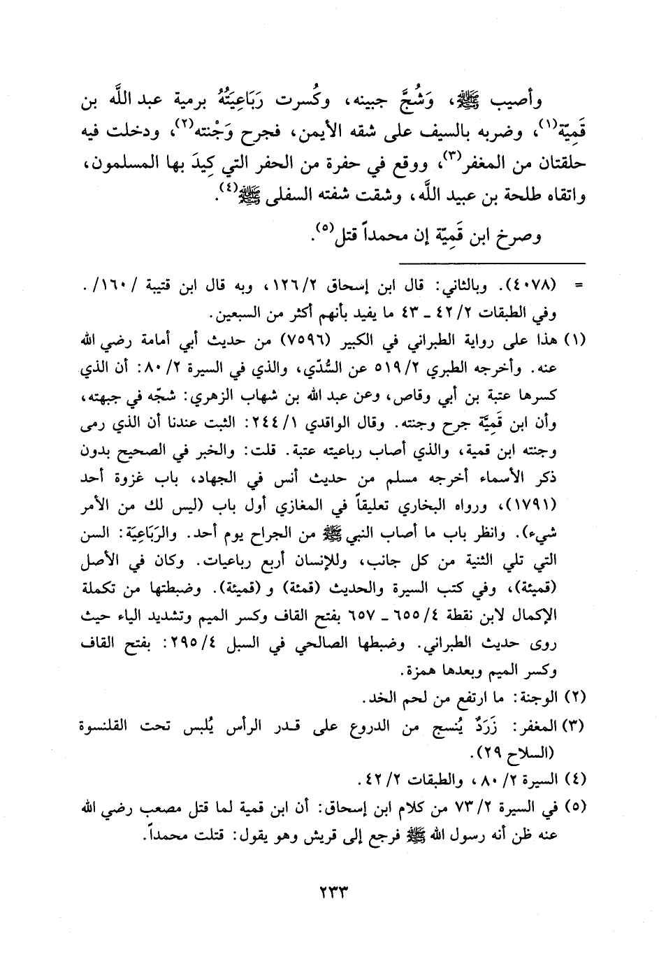 (¬5) في السيرة 2/ 73 من كلام ابن إسحاق: أن ابن قمية لما قتل مصعب رضي الله عنه ظن أنه رسول الله صلى الله عليه وسلم فرجع إلى قريش وهو يقول: قتلت محمدا.