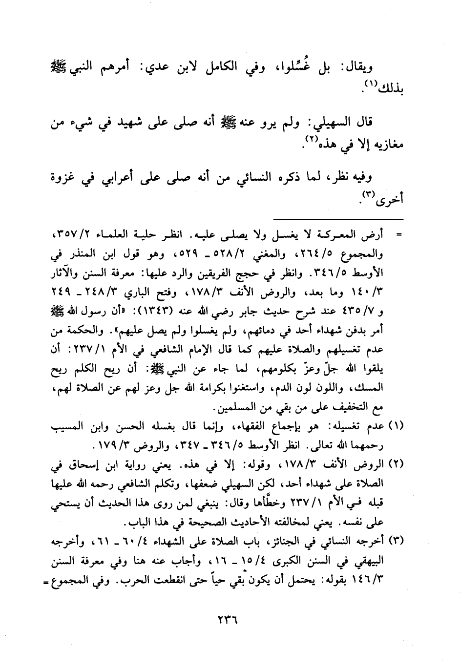 (¬2) الروض الأنف 3/ 178، وقوله: إلا في هذه. يعني رواية ابن إسحاق في الصلاة على شهداء أحد، لكن السهيلي ضعفها، وتكلم الشافعي رحمه الله عليها قبله في الأم 1/ 237 وخطّأها وقال: ينبغي لمن روى هذا الحديث أن يستحي على نفسه. يعني لمخالفته الأحاديث الصحيحة في هذا الباب.