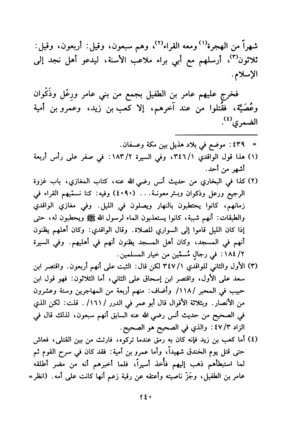 فخرج عليهم عامر بن الطفيل بجمع من بني عامر ورعل وذكوان وعصيّة، فقتلوا من عند آخرهم، إلا كعب بن زيد، وعمرو بن أمية الضمري (¬4).
