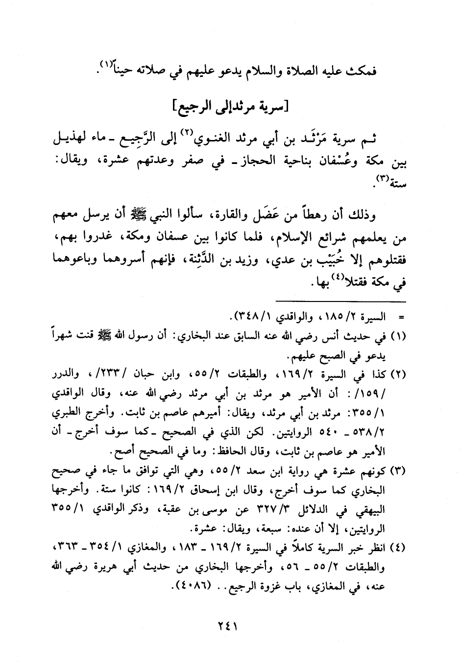 (¬4) انظر خبر السرية كاملا في السيرة 2/ 169 - 183، والمغازي 1/ 354 - 363، والطبقات 2/ 55 - 56، وأخرجها البخاري من حديث أبي هريرة رضي الله عنه، في المغازي، باب غزوة الرجيع. . (4086).