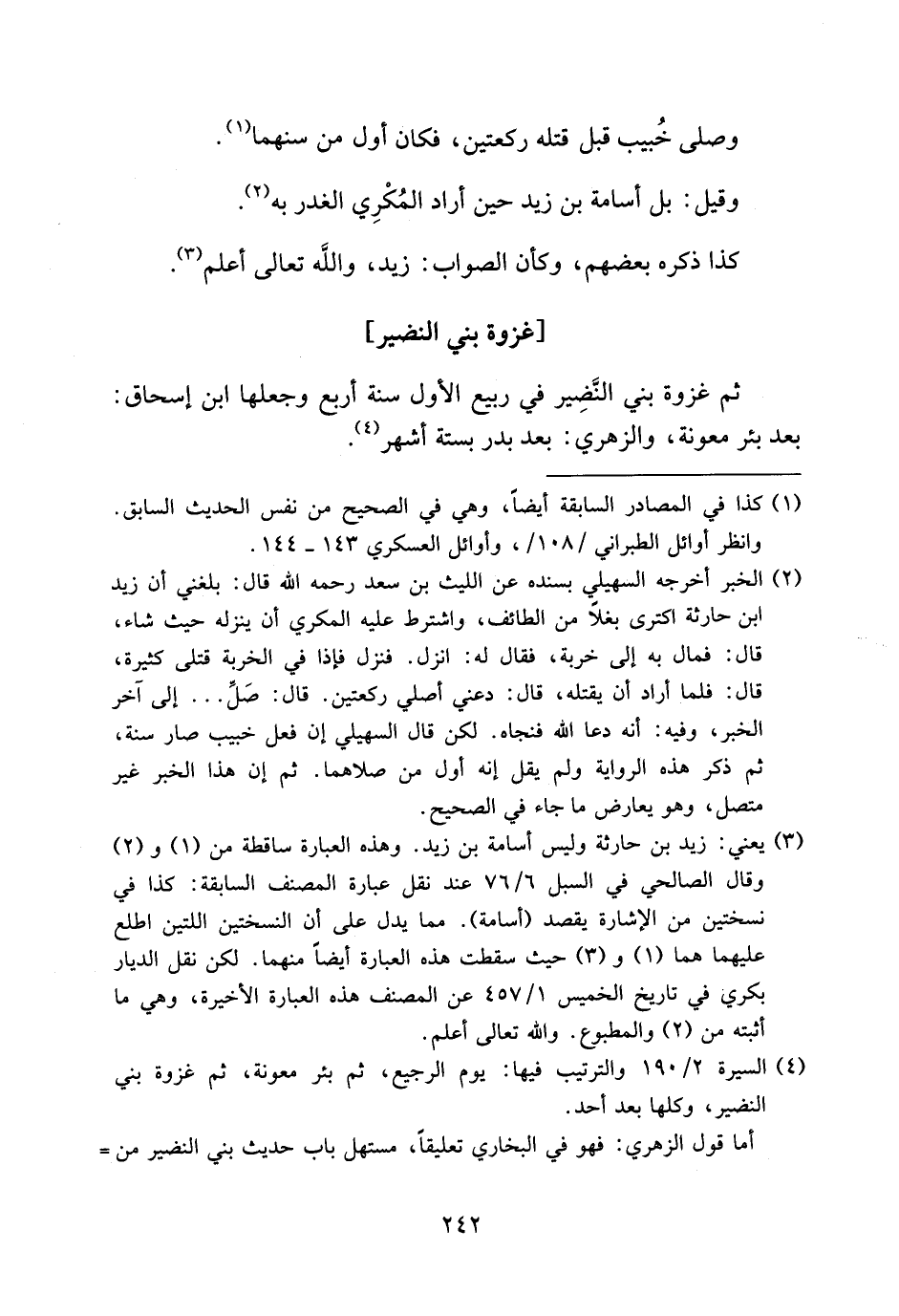 (¬3) يعني: زيد بن حارثة وليس أسامة بن زيد. وهذه العبارة ساقطة من (1) و (2) وقال الصالحي في السبل 6/ 76 عند نقل عبارة المصنف السابقة: كذا في نسختين من الإشارة يقصد (أسامة). مما يدل على أن النسختين اللتين اطلع عليهما هما (1) و (3) حيث سقطت هذه العبارة أيضا منهما. لكن نقل الديار بكري في تاريخ الخميس 1/ 457 عن المصنف هذه العبارة الأخيرة، وهي ما أثبته من (2) والمطبوع. والله تعالى أعلم.