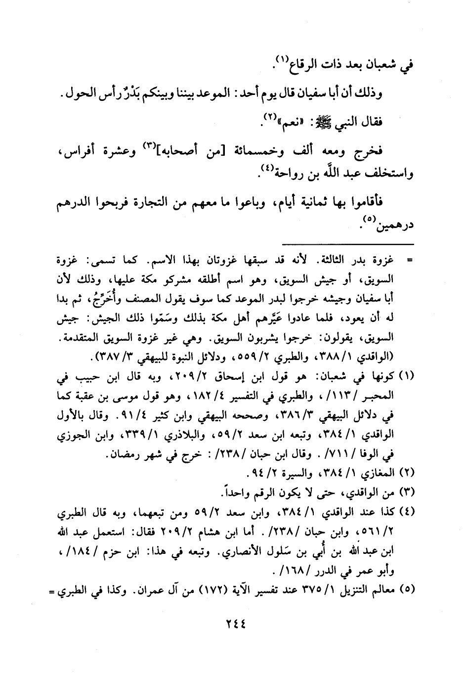 (¬1) كونها في شعبان: هو قول ابن إسحاق 2/ 209، وبه قال ابن حبيب في المحبر/113/، والطبري في التفسير 4/ 182، وهو قول موسى بن عقبة كما في دلائل البيهقي 3/ 386، وصححه البيهقي وابن كثير 4/ 91. وقال بالأول الواقدي 1/ 384، وتبعه ابن سعد 2/ 59، والبلاذري 1/ 339، وابن الجوزي في الوفا/711/. وقال ابن حبان/238/: خرج في شهر رمضان.