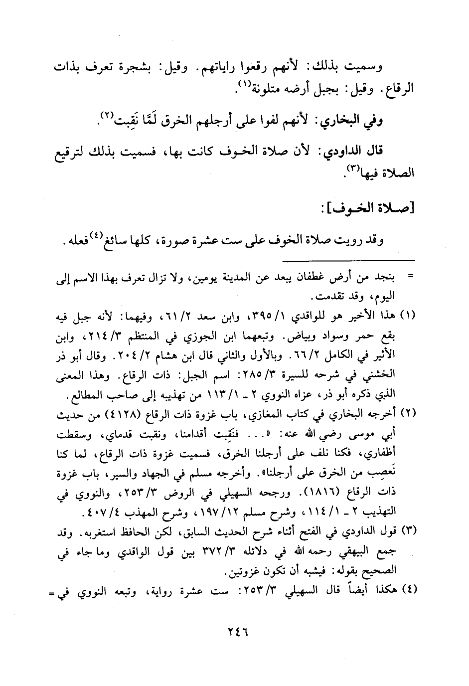(¬2) أخرجه البخاري في كتاب المغازي، باب غزوة ذات الرقاع (4128) من حديث أبي موسى رضي الله عنه: «. . . فنقبت أقدامنا، ونقبت قدماي، وسقطت أظفاري، فكنا نلف على أرجلنا الخرق، فسميت غزوة ذات الرقاع، لما كنا نعصب من الخرق على أرجلنا». وأخرجه مسلم في الجهاد والسير، باب غزوة ذات الرقاع (1816). ورجحه السهيلي في الروض 3/ 253، والنووي في التهذيب 2 - 1/ 114، وشرح مسلم 12/ 197، وشرح المهذب 4/ 407.