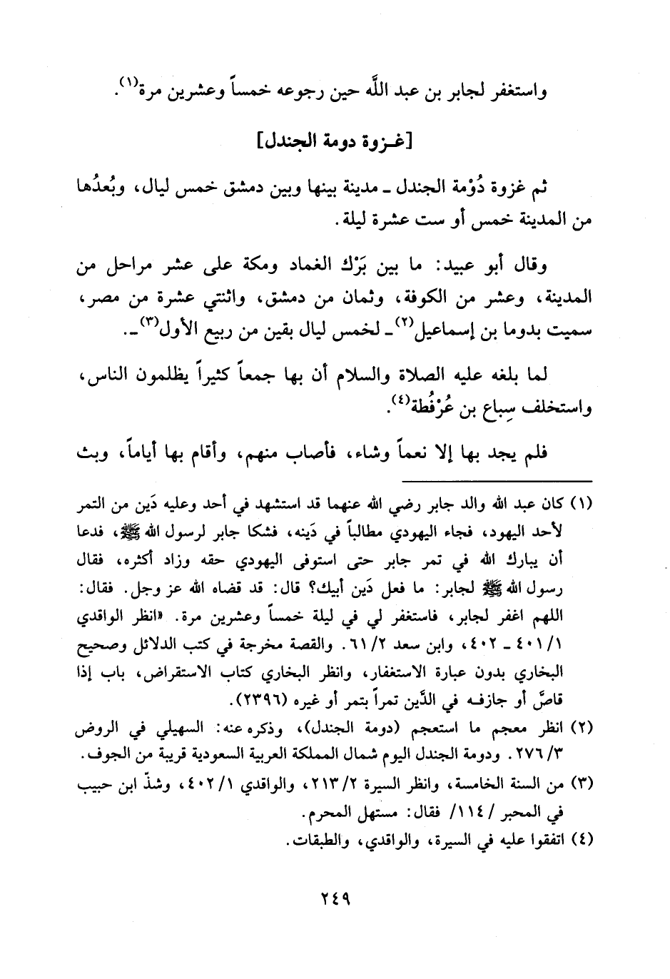 (¬1) كان عبد الله والد جابر رضي الله عنهما قد استشهد في أحد وعليه دين من التمر لأحد اليهود، فجاء اليهودي مطالبا في دينه، فشكا جابر لرسول الله صلى الله عليه وسلم، فدعا أن يبارك الله في تمر جابر حتى استوفى اليهودي حقه وزاد أكثره، فقال رسول الله صلى الله عليه وسلم لجابر: ما فعل دين أبيك؟ قال: قد قضاه الله عز وجل. فقال: اللهم اغفر لجابر، فاستغفر لي في ليلة خمسا وعشرين مرة. «انظر الواقدي 1/ 401 - 402، وابن سعد 2/ 61. والقصة مخرجة في كتب الدلائل وصحيح البخاري بدون عبارة الاستغفار، وانظر البخاري كتاب الاستقراض، باب إذا قاصّ أو جازفه في الدّين تمرا بتمر أو غيره (2396).