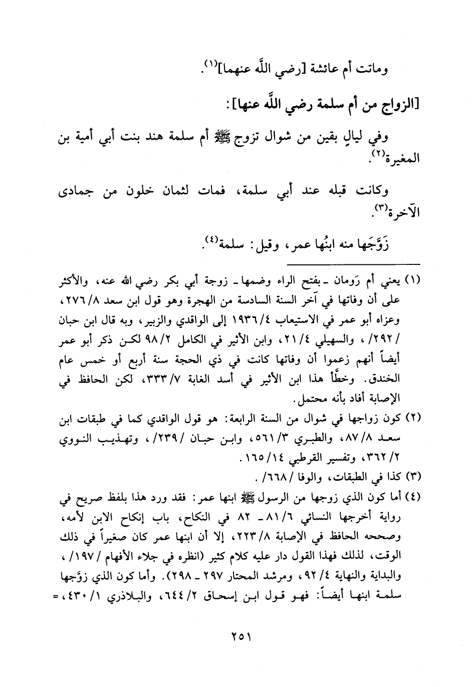 (¬4) أما كون الذي زوجها من الرسول صلى الله عليه وسلم ابنها عمر: فقد ورد هذا بلفظ صريح في رواية أخرجها النسائي 6/ 81 - 82 في النكاح، باب إنكاح الابن لأمه، وصححه الحافظ في الإصابة 8/ 223، إلا أن ابنها عمر كان صغيرا في ذلك الوقت، لذلك فهذا القول دار عليه كلام كثير (انظره في جلاء الأفهام/197/، والبداية والنهاية 4/ 92، ومرشد المحتار 297 - 298). وأما كون الذي زوّجها سلمة ابنها أيضا: فهو قول ابن إسحاق 2/ 644، والبلاذري 1/ 430، -