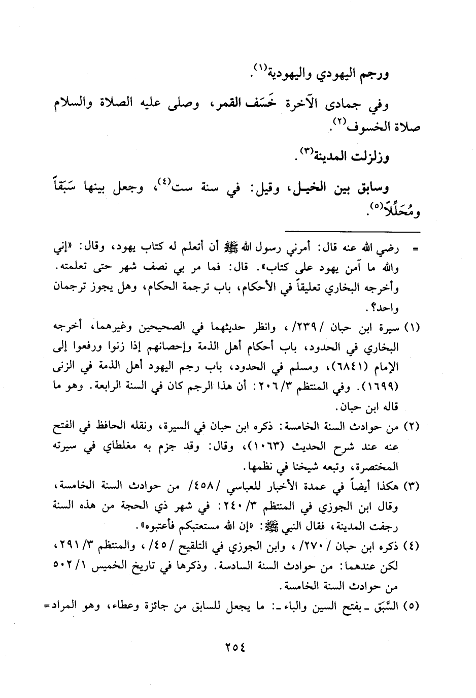 (¬1) سيرة ابن حبان/239/، وانظر حديثهما في الصحيحين وغيرهما، أخرجه البخاري في الحدود، باب أحكام أهل الذمة وإحصانهم إذا زنوا ورفعوا إلى الإمام (6841)، ومسلم في الحدود، باب رجم اليهود أهل الذمة في الزنى (1699). وفي المنتظم 3/ 206: أن هذا الرجم كان في السنة الرابعة. وهو ما قاله ابن حبان.