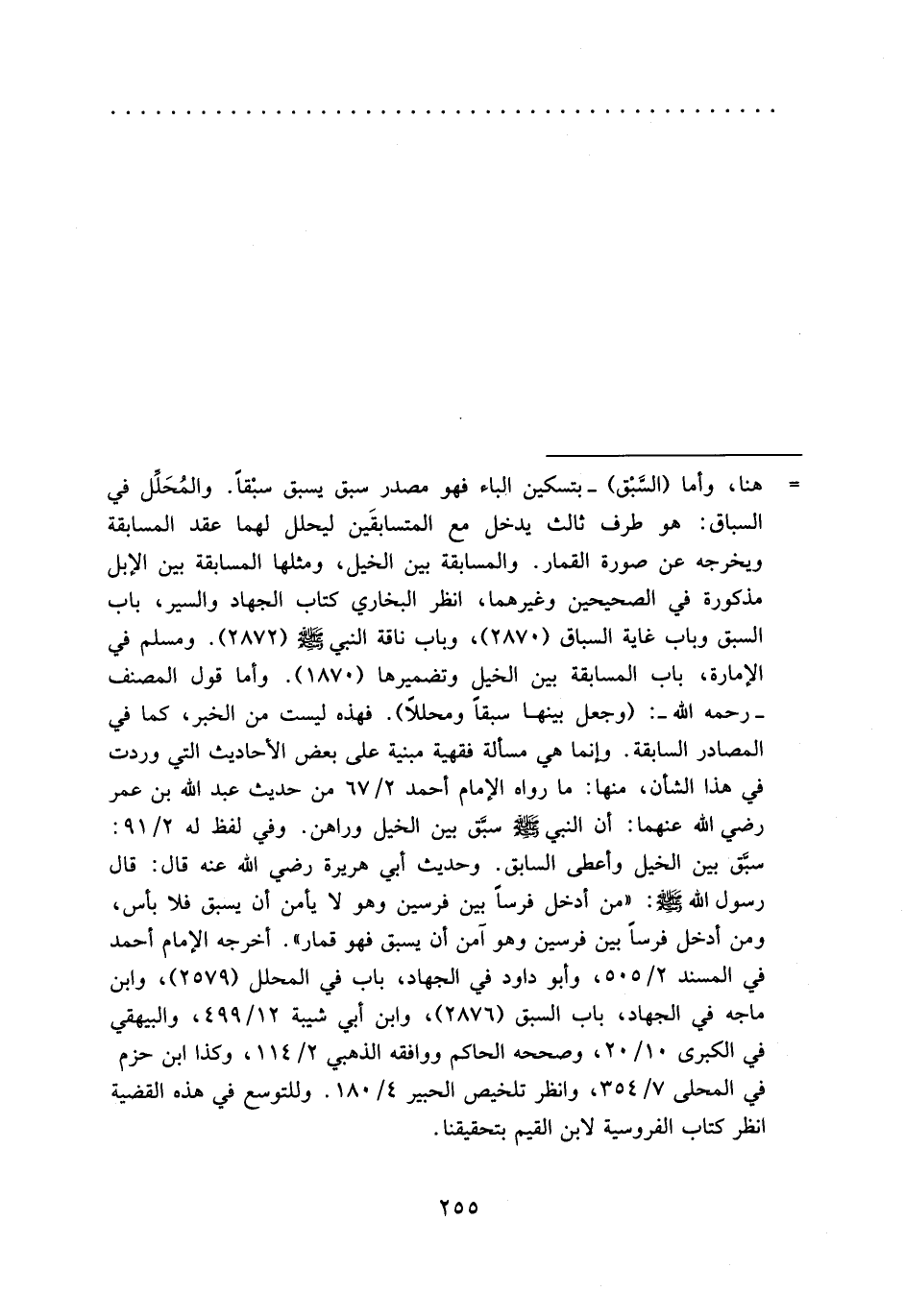 = هنا، وأما (السّبق) -بتسكين الباء فهو مصدر سبق يسبق سبقا. والمحلّل في السباق: هو طرف ثالث يدخل مع المتسابقين ليحلل لهما عقد المسابقة ويخرجه عن صورة القمار. والمسابقة بين الخيل، ومثلها المسابقة بين الإبل مذكورة في الصحيحين وغيرهما، انظر البخاري كتاب الجهاد والسير، باب السبق وباب غاية السباق (2870)، وباب ناقة النبي صلى الله عليه وسلم (2872). ومسلم في الإمارة، باب المسابقة بين الخيل وتضميرها (1870). وأما قول المصنف -رحمه الله-: (وجعل بينها سبقا ومحللا). فهذه ليست من الخبر، كما في المصادر السابقة. وإنما هي مسألة فقهية مبنية على بعض الأحاديث التي وردت في هذا الشأن، منها: ما رواه الإمام أحمد 2/ 67 من حديث عبد الله بن عمر رضي الله عنهما: أن النبي صلى الله عليه وسلم سبّق بين الخيل وراهن. وفي لفظ له 2/ 91: سبّق بين الخيل وأعطى السابق. وحديث أبي هريرة رضي الله عنه قال: قال رسول الله صلى الله عليه وسلم: «من أدخل فرسا بين فرسين وهو لا يأمن أن يسبق فلا بأس، ومن أدخل فرسا بين فرسين وهو آمن أن يسبق فهو قمار». أخرجه الإمام أحمد في المسند 2/ 505، وأبو داود في الجهاد، باب في المحلل (2579)، وابن ماجه في الجهاد، باب السبق (2876)، وابن أبي شيبة 12/ 499، والبيهقي في الكبرى 10/ 20، وصححه الحاكم ووافقه الذهبي 2/ 114، وكذا ابن حزم في المحلى 7/ 354، وانظر تلخيص الحبير 4/ 180. وللتوسع في هذه القضية انظر كتاب الفروسية لابن القيم بتحقيقنا.