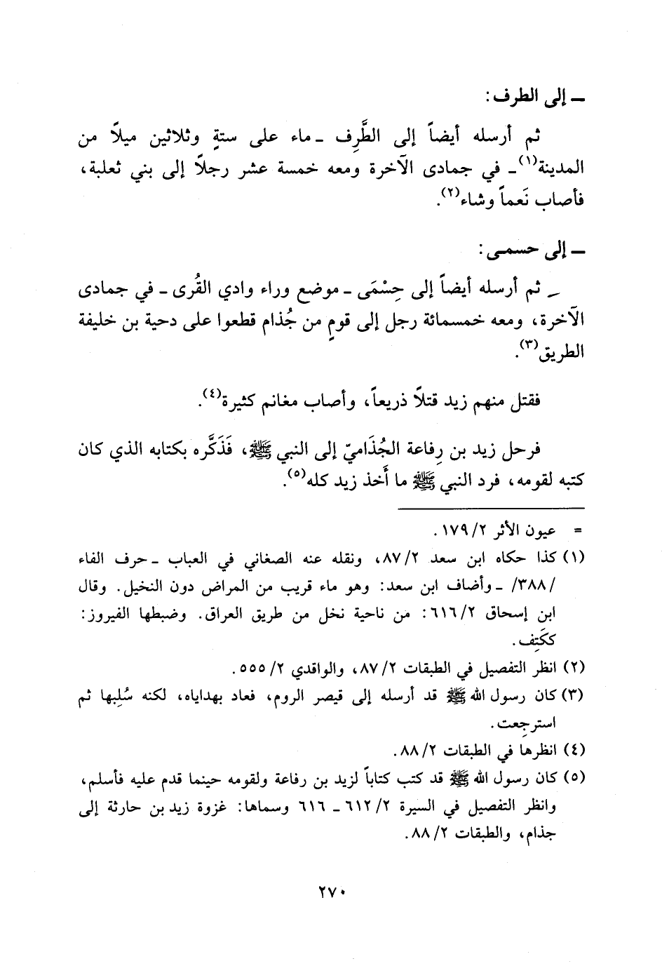 (¬5) كان رسول الله صلى الله عليه وسلم قد كتب كتابا لزيد بن رفاعة ولقومه حينما قدم عليه فأسلم، وانظر التفصيل في السيرة 2/ 612 - 616 وسماها: غزوة زيد بن حارثة إلى جذام، والطبقات 2/ 88.