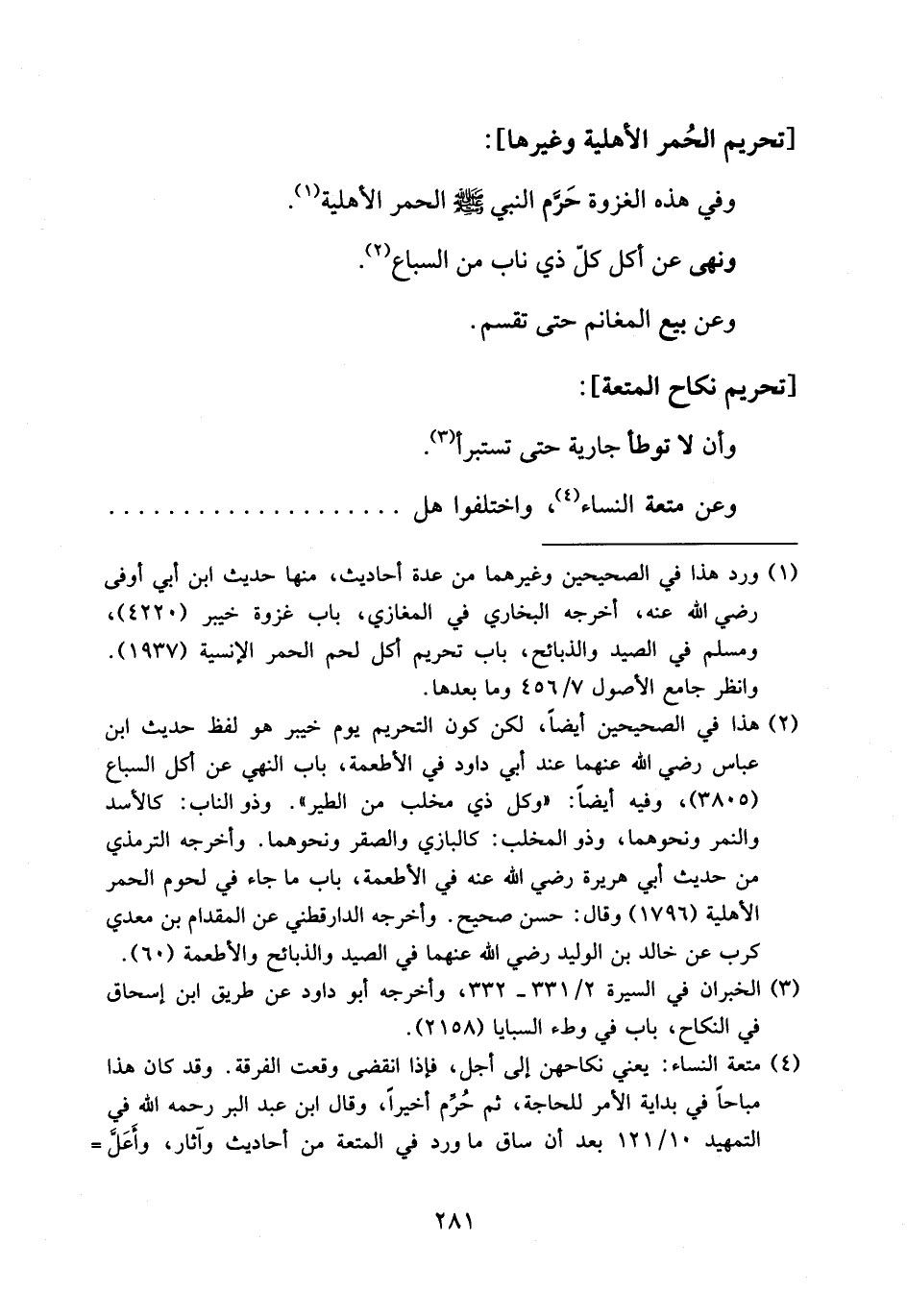 (¬1) ورد هذا في الصحيحين وغيرهما من عدة أحاديث، منها حديث ابن أبي أوفى رضي الله عنه، أخرجه البخاري في المغازي، باب غزوة خيبر (4220)، ومسلم في الصيد والذبائح، باب تحريم أكل لحم الحمر الإنسية (1937). وانظر جامع الأصول 7/ 456 وما بعدها.
