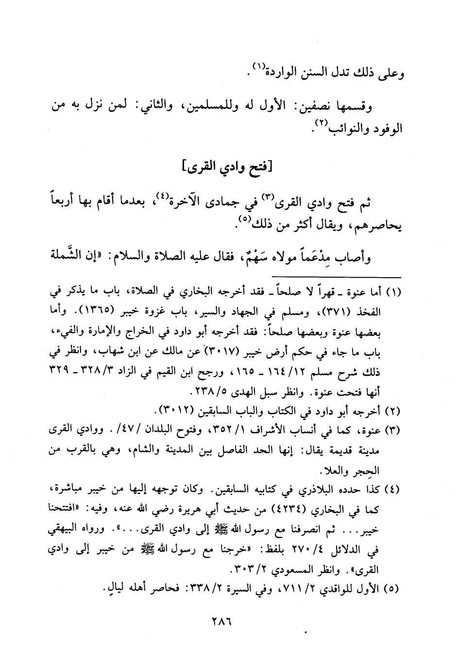 (¬4) كذا حدده البلاذري في كتابيه السابقين. وكان توجهه إليها من خيبر مباشرة، كما في البخاري (4234) من حديث أبي هريرة رضي الله عنه، وفيه: «افتتحنا خيبر. . . ثم انصرفنا مع رسول الله صلى الله عليه وسلم إلى وادي القرى. . .». ورواه البيهقي في الدلائل 4/ 270 بلفظ: «خرجنا مع رسول الله صلى الله عليه وسلم من خيبر إلى وادي القرى». وانظر المسعودي 2/ 303.