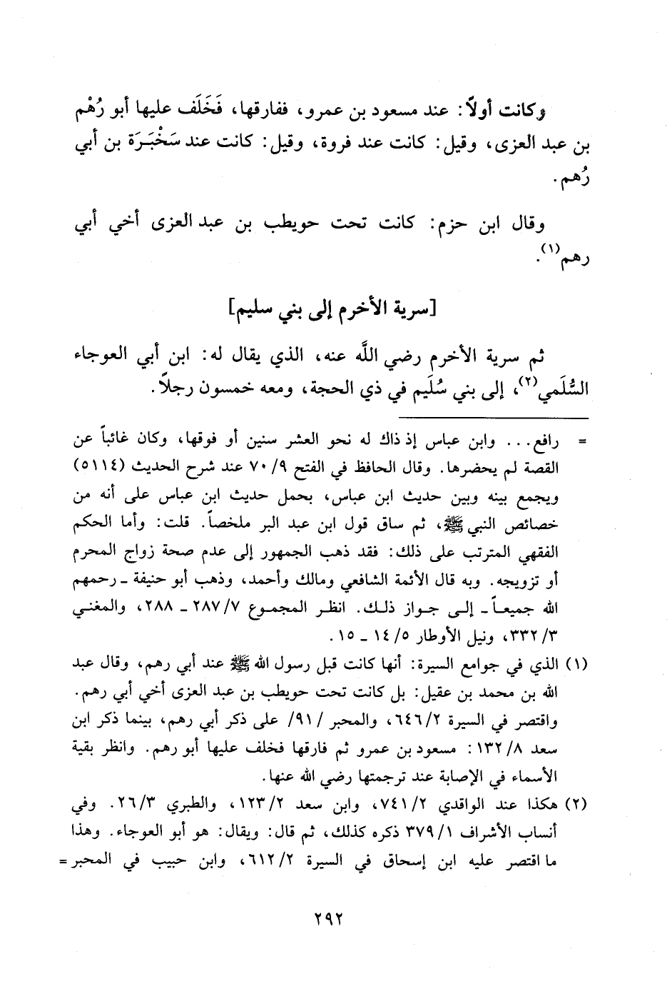 (¬1) الذي في جوامع السيرة: أنها كانت قبل رسول الله صلى الله عليه وسلم عند أبي رهم، وقال عبد الله بن محمد بن عقيل: بل كانت تحت حويطب بن عبد العزى أخي أبي رهم. واقتصر في السيرة 2/ 646، والمحبر/91/على ذكر أبي رهم، بينما ذكر ابن سعد 8/ 132: مسعود بن عمرو ثم فارقها فخلف عليها أبو رهم. وانظر بقية الأسماء في الإصابة عند ترجمتها رضي الله عنها.