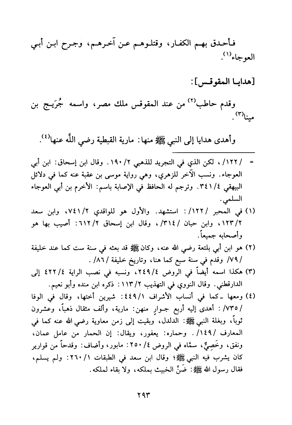 (¬4) ومعها-كما في أنساب الأشراف 1/ 449: شيرين أختها، وقال في الوفا /735/: أهدى إليه أربع جوار منهن: مارية، وألف مثقال ذهبا، وعشرون ثوبا، وبغلة النبي صلى الله عليه وسلم: الدلدل، وبقيت إلى زمن معاوية رضي الله عنه كما في المعارف/149/. وحماره: يعفور، ويقال: إن الحمار من عامل عمان، ونفق، وخصيّ، سمّاه في الروض 4/ 250: مابور، وأضاف: وقدحا من قوارير كان يشرب فيه النبي صلى الله عليه وسلم؛ وقال ابن سعد في الطبقات 1/ 260: ولم يسلم، فقال رسول الله صلى الله عليه وسلم: ضنّ الخبيث بملكه، ولا بقاء لملكه.