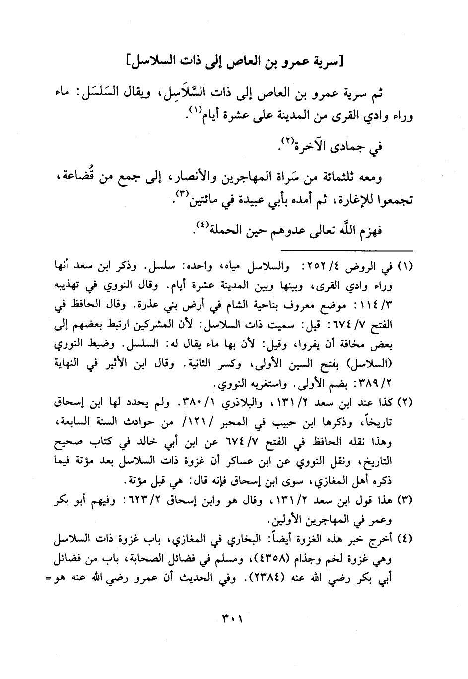 (¬1) في الروض 4/ 252: والسلاسل مياه، واحده: سلسل. وذكر ابن سعد أنها وراء وادي القرى، وبينها وبين المدينة عشرة أيام. وقال النووي في تهذيبه 3/ 114: موضع معروف بناحية الشام في أرض بني عذرة. وقال الحافظ في الفتح 7/ 674: قيل: سميت ذات السلاسل: لأن المشركين ارتبط بعضهم إلى بعض مخافة أن يفروا، وقيل: لأن بها ماء يقال له: السلسل. وضبط النووي (السلاسل) بفتح السين الأولى، وكسر الثانية. وقال ابن الأثير في النهاية 2/ 389: بضم الأولى. واستغربه النووي.