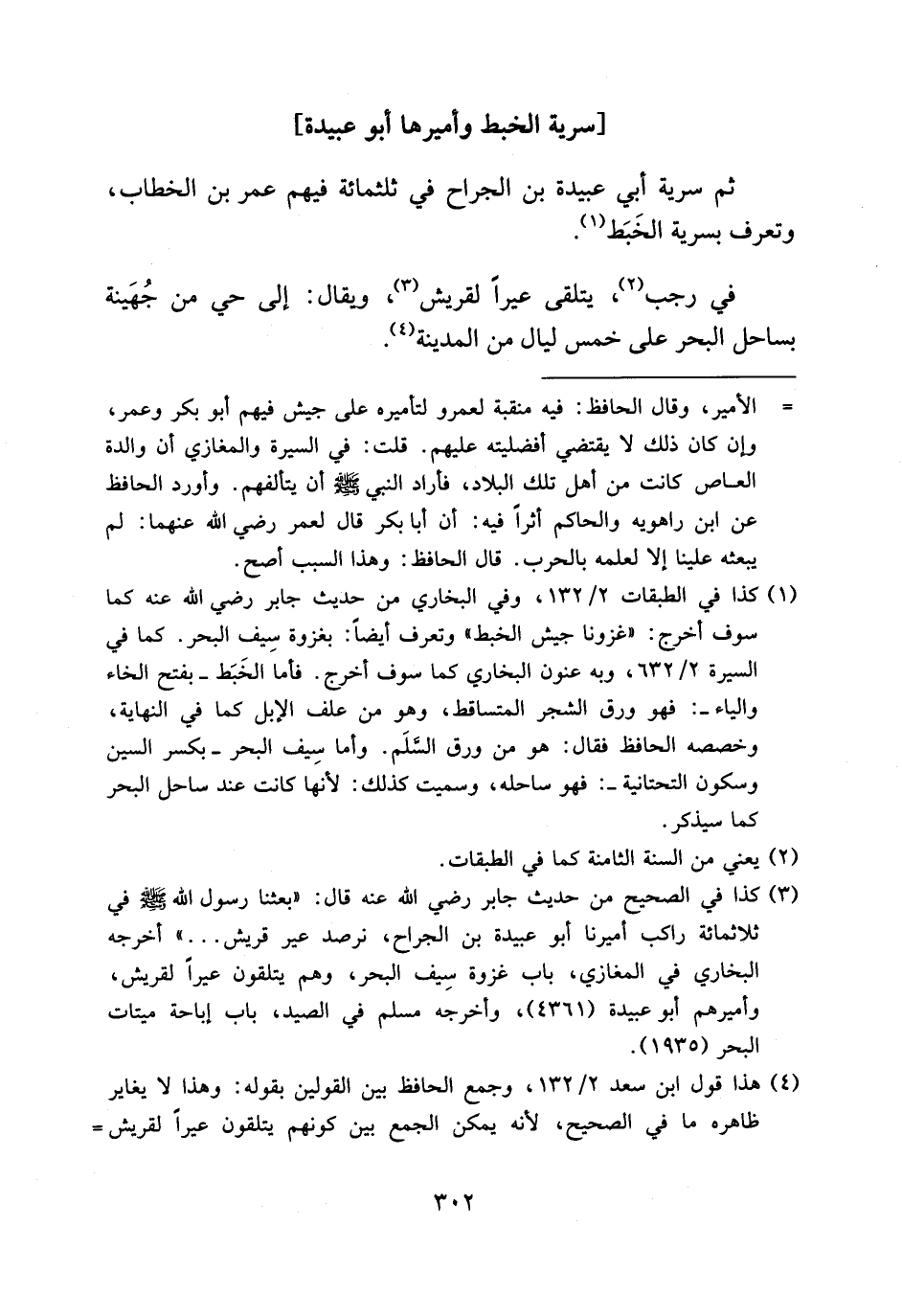 (¬3) كذا في الصحيح من حديث جابر رضي الله عنه قال: «بعثنا رسول الله صلى الله عليه وسلم في ثلاثمائة راكب أميرنا أبو عبيدة بن الجراح، نرصد عير قريش. . .» أخرجه البخاري في المغازي، باب غزوة سيف البحر، وهم يتلقون عيرا لقريش، وأميرهم أبو عبيدة (4361)، وأخرجه مسلم في الصيد، باب إباحة ميتات البحر (1935).