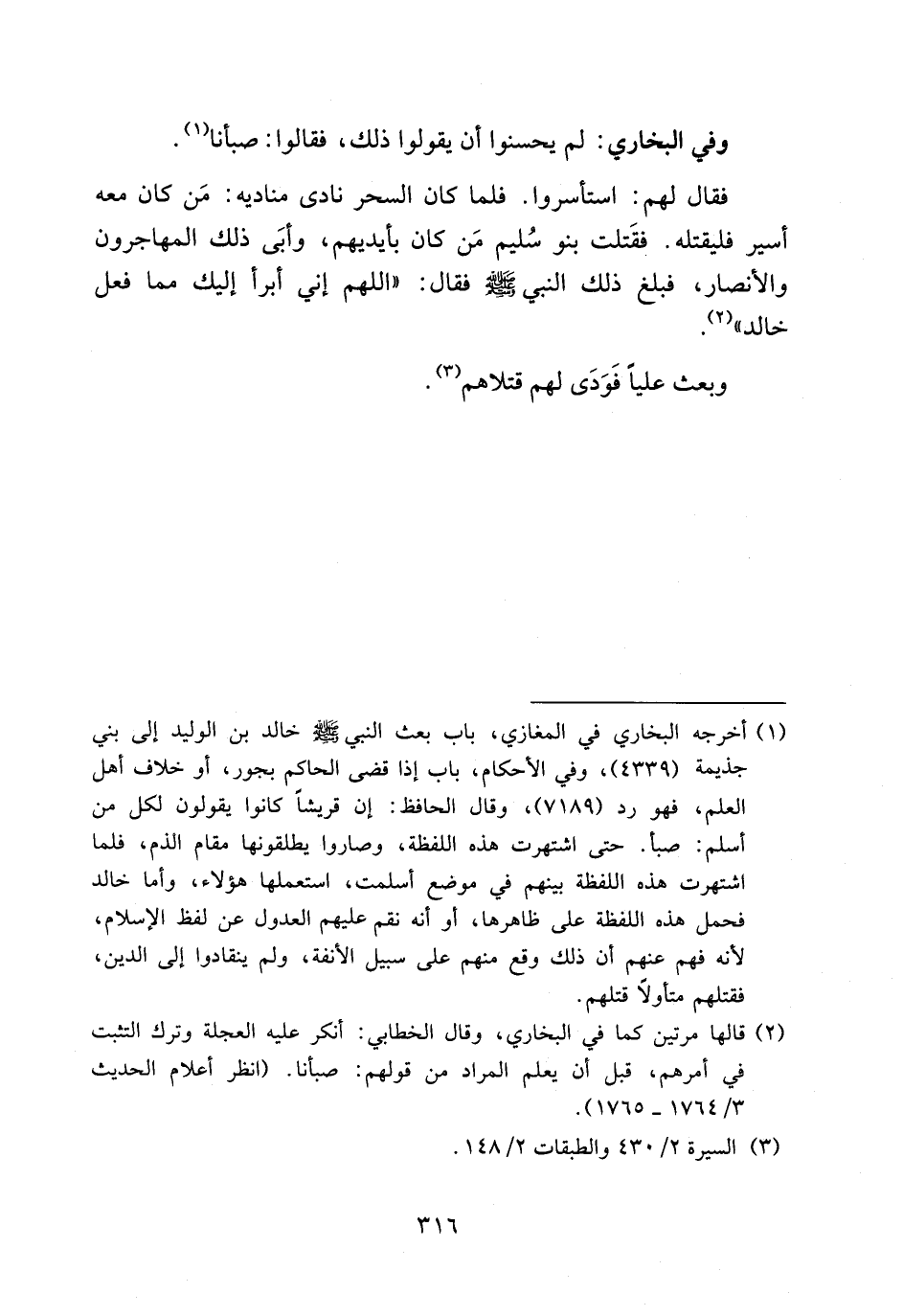 (¬1) أخرجه البخاري في المغازي، باب بعث النبي صلى الله عليه وسلم خالد بن الوليد إلى بني جذيمة (4339)، وفي الأحكام، باب إذا قضى الحاكم بجور، أو خلاف أهل العلم، فهو رد (7189)، وقال الحافظ: إن قريشا كانوا يقولون لكل من أسلم: صبأ. حتى اشتهرت هذه اللفظة، وصاروا يطلقونها مقام الذم، فلما اشتهرت هذه اللفظة بينهم في موضع أسلمت، استعملها هؤلاء، وأما خالد فحمل هذه اللفظة على ظاهرها، أو أنه نقم عليهم العدول عن لفظ الإسلام، لأنه فهم عنهم أن ذلك وقع منهم على سبيل الأنفة، ولم ينقادوا إلى الدين، فقتلهم متأولا قتلهم.