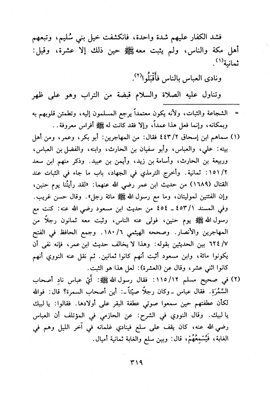(¬1) سماهم ابن إسحاق 2/ 443 فقال: من المهاجرين: أبو بكر، وعمر، ومن أهل بيته: علي، والعباس، وأبو سفيان بن الحارث، وابنه، والفضل بن العباس، وربيعة بن الحارث، وأسامة بن زيد، وأيمن بن عبيد. وذكر منهم ابن سعد 2/ 151: ثمانية. وأخرج الترمذي في الجهاد، باب ما جاء في الثبات عند القتال (1689) من حديث ابن عمر رضي الله عنهما: «لقد رأيتنا يوم حنين، وإن الفئتين لموليتان، وما مع رسول الله صلى الله عليه وسلم مائة رجل». وقال حسن غريب. وفي المسند 1/ 453 - 454 من حديث ابن مسعود رضي الله عنه: كنت مع رسول الله صلى الله عليه وسلم يوم حنين، فولى عنه الناس، وثبت معه ثمانون رجلا من المهاجرين والأنصار. وصححه الهيثمي 6/ 180. وجمع الحافظ في الفتح 7/ 624 بين الحديثين بقوله: وهذا لا يخالف حديث ابن عمر، فإنه نفى أن يكونوا مائة، وابن مسعود أثبت أنهم كانوا ثمانين. ثم نقل عنه النووي أنهم كانوا اثني عشر، وقال عن (العشرة): لعل هذا هو الثبت.