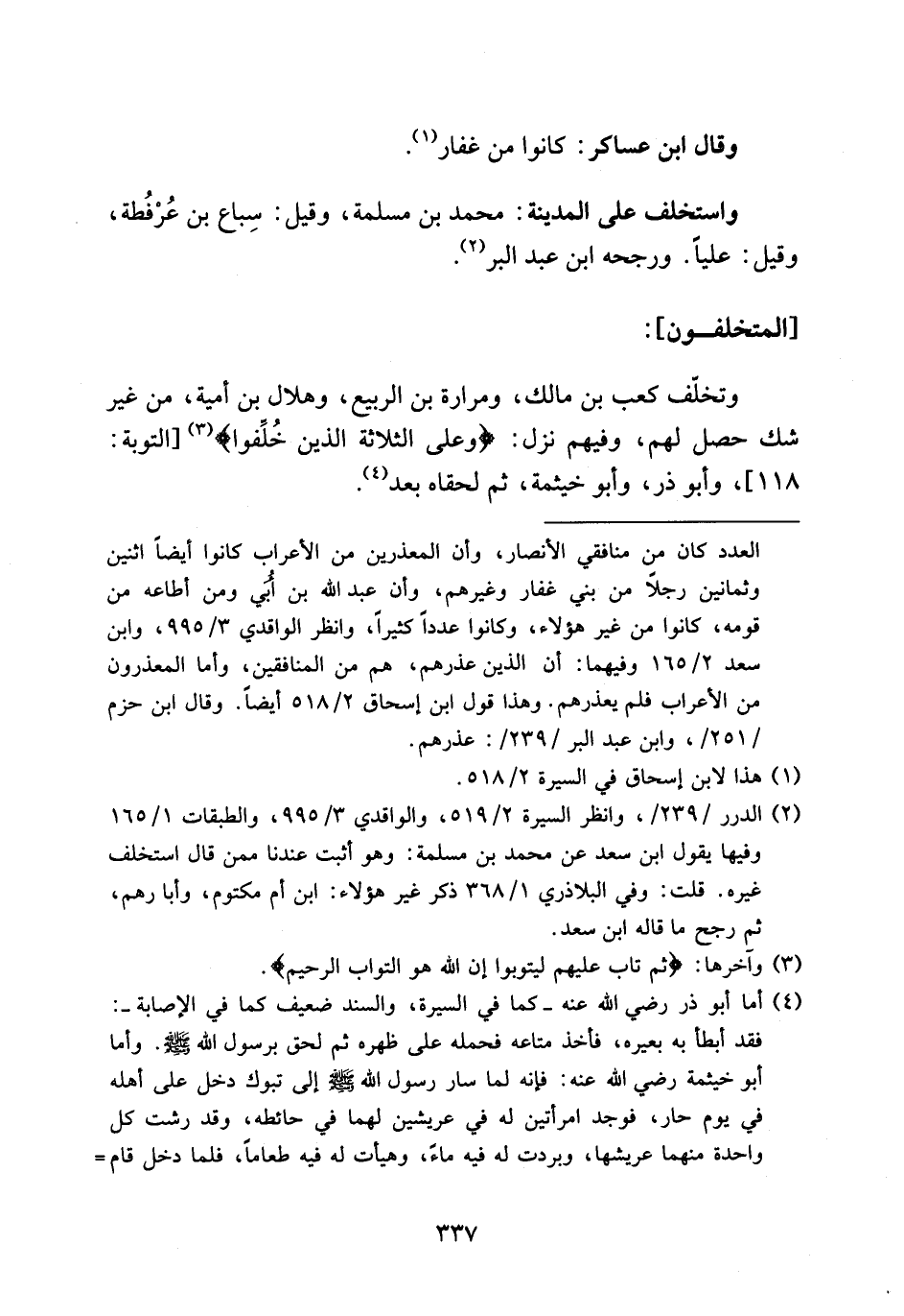 = العدد كان من منافقي الأنصار، وأن المعذرين من الأعراب كانوا أيضا اثنين وثمانين رجلا من بني غفار وغيرهم، وأن عبد الله بن أبي ومن أطاعه من قومه، كانوا من غير هؤلاء، وكانوا عددا كثيرا، وانظر الواقدي 3/ 995، وابن سعد 2/ 165 وفيهما: أن الذين عذرهم، هم من المنافقين، وأما المعذرون من الأعراب فلم يعذرهم. وهذا قول ابن إسحاق 2/ 518 أيضا. وقال ابن حزم /251/، وابن عبد البر/239/: عذرهم.